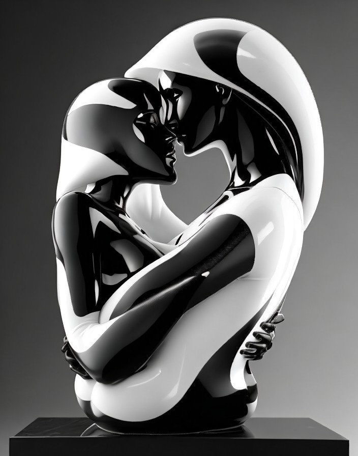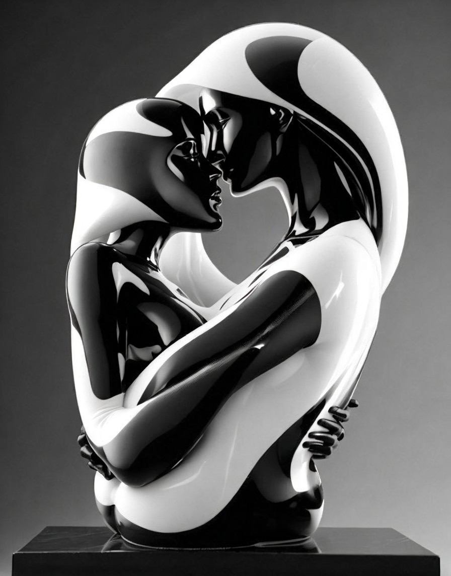 An artistic black and white image of an intertwined couple resembling a yin-yang symbol.