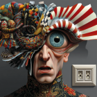 The image features an artistic face sculpture emerging from a wall socket, characterized by exaggerated features, colorful patterns, and surrealistic details, blending human and mechanical elements.