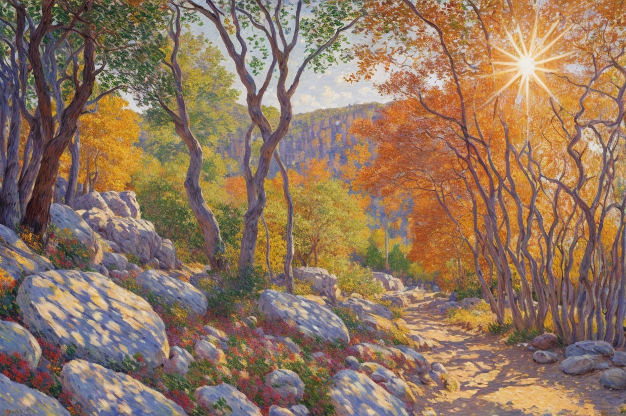 Late summer, too hot to hike this trail, should be cooler soon - trees are starting to change color.