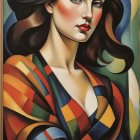 A stunning portrait of a young woman with flowing red hair, adorned with flowers. She wears a colorful gown, set against a vibrant, natural background, exuding grace and beauty.