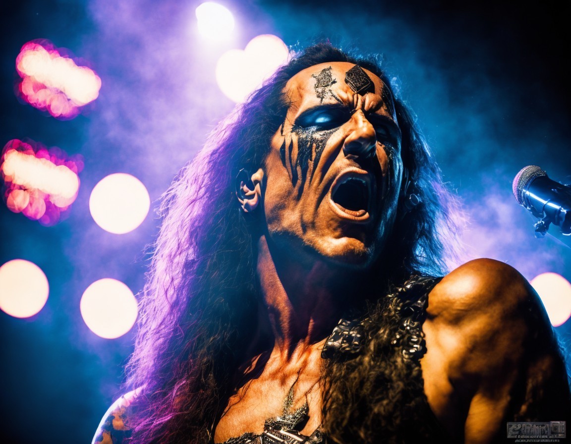 A musician with face paint and a wild expression plays guitar on stage, with vibrant purple stage lights in the background.