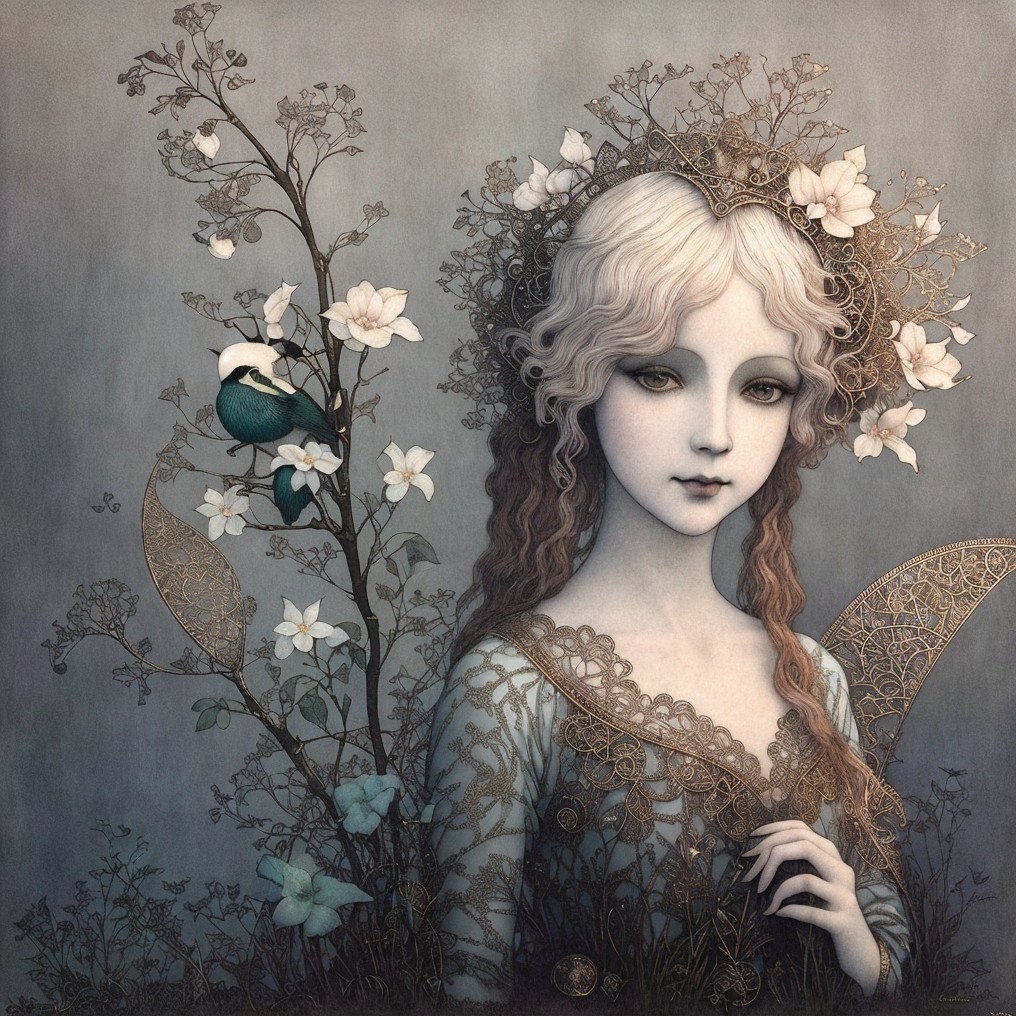 A serene and ethereal figure with long, flowing hair, adorned in a rich blue gown and intricate crown, stands amidst delicate white flowers, embodying a sense of grace and elegance.