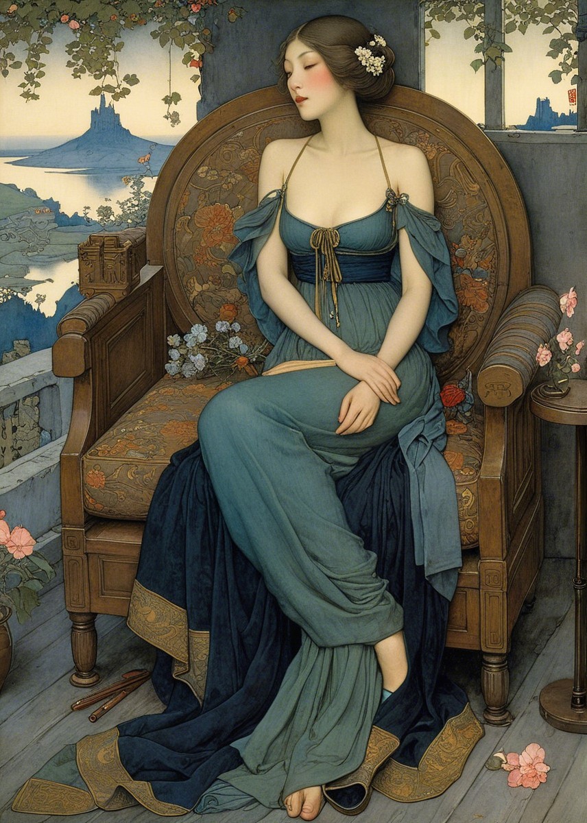A serene woman in an elegant blue gown sits gracefully on an ornate armchair, surrounded by floral patterns and a tranquil landscape, exuding grace and tranquility.