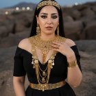 A woman stands confidently by the shore, adorned in striking gold jewelry. Her elegant black off-shoulder outfit contrasts beautifully with the soft twilight backdrop.