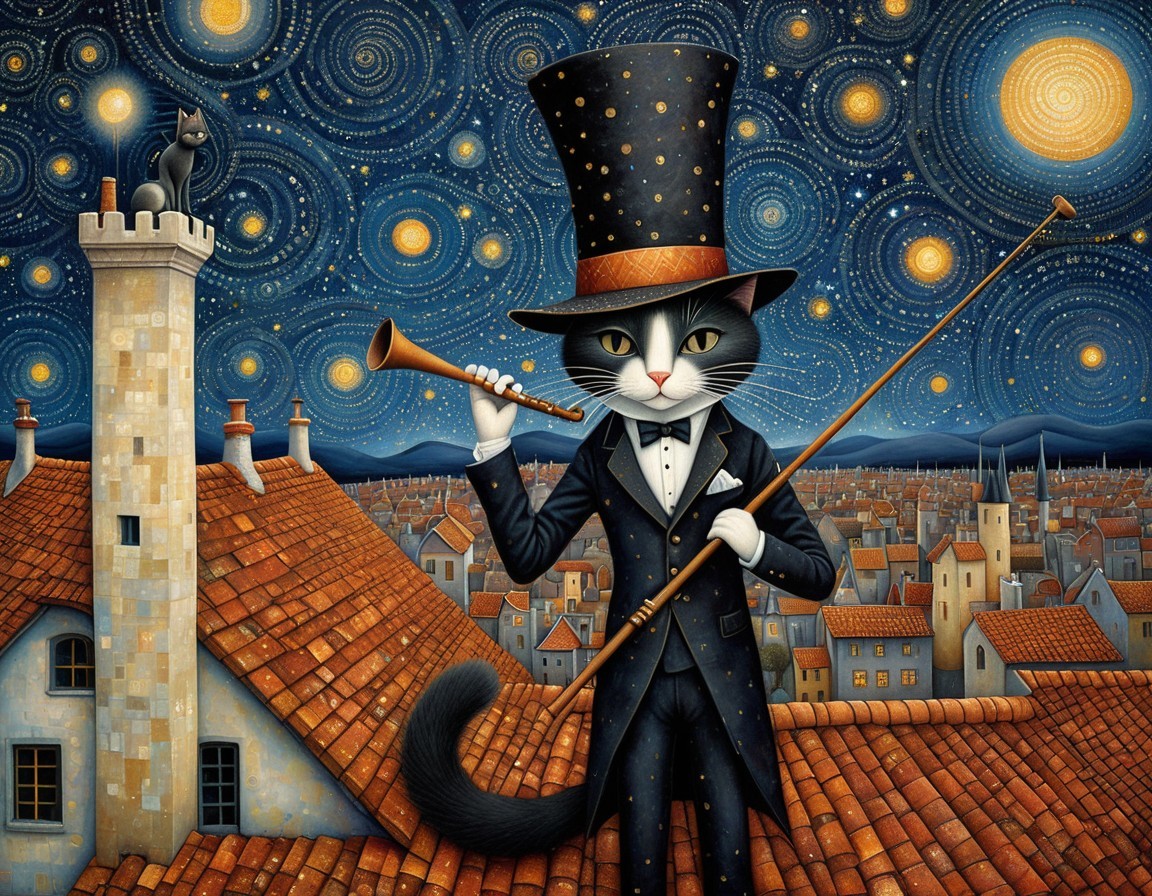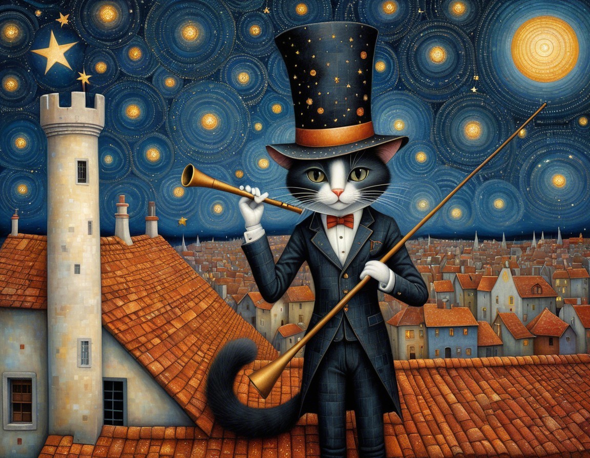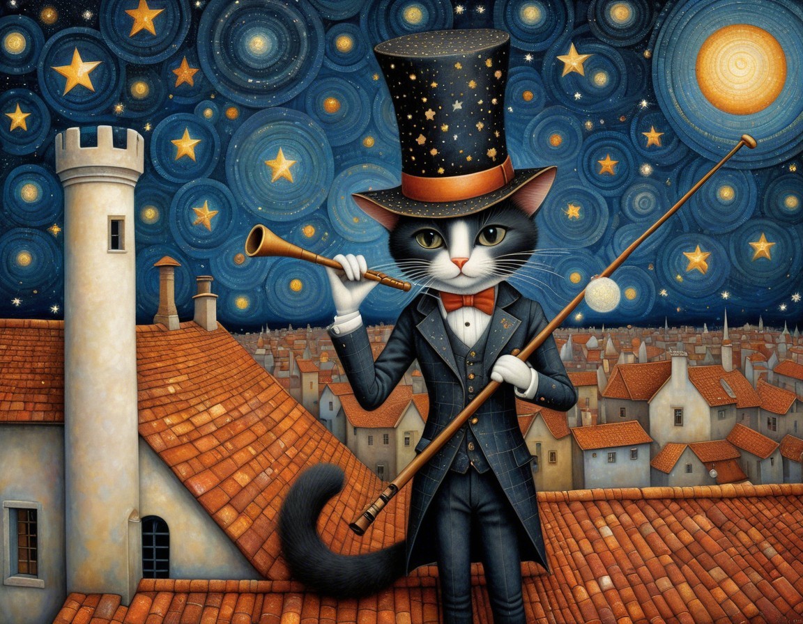 A whimsical painting of an anthropomorphic cat dressed as a magician with a wand and trumpet, standing on a tiled roof under a starry, swirling sky.