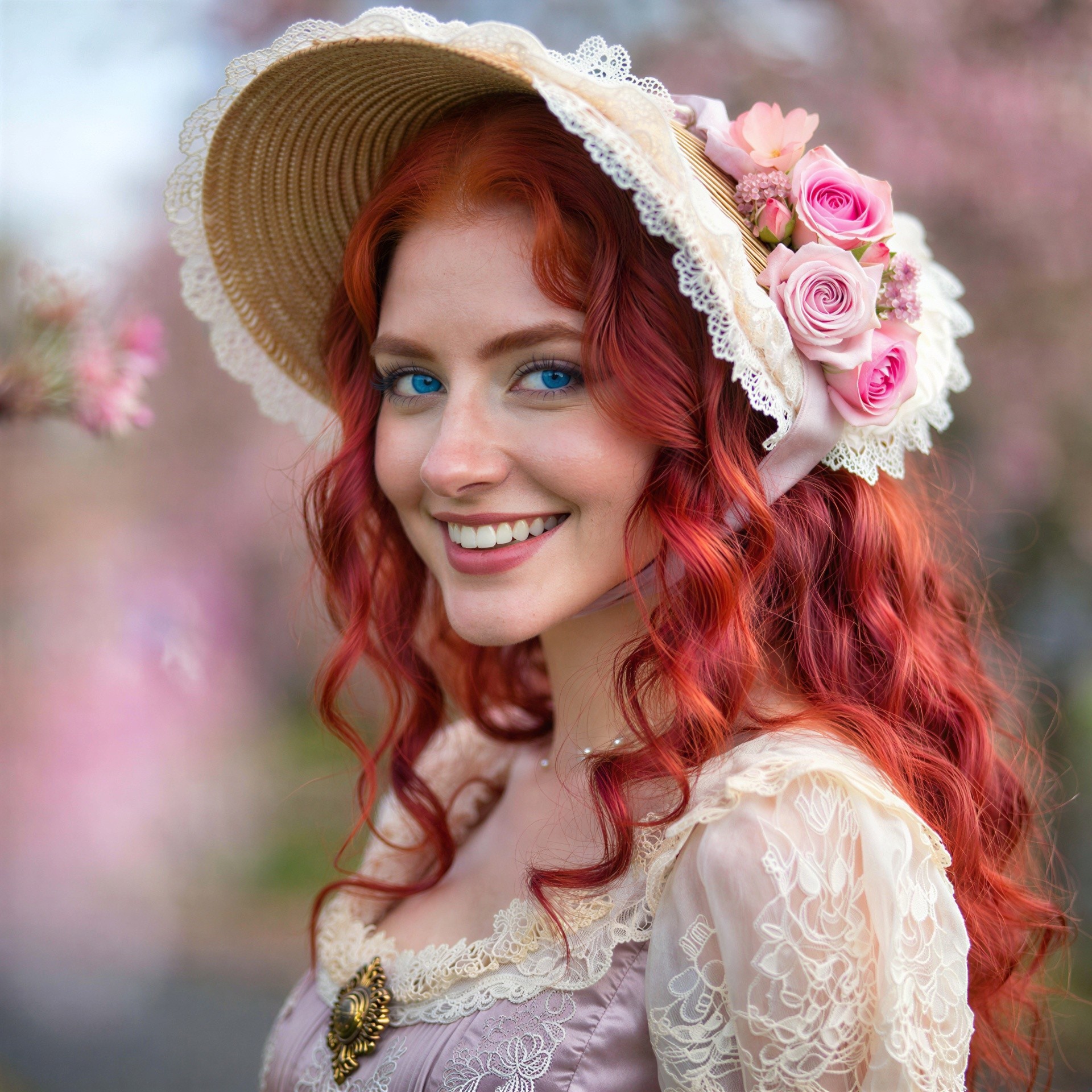 A close-up shot of a young woman with fair skin, captivating deep blue eyes, and vibrant long, flowing red hair, with subtle curls and a slight ombre effect. She is wearing a delicate straw hat adorned with a white lace trim that has small scalloped edges around the brim. The hat