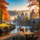 A foggy autumn landscape features a winding path lined with vibrant orange leaves. A golden retriever stands near the edge, with a tranquil lake and distant castle visible in the background.