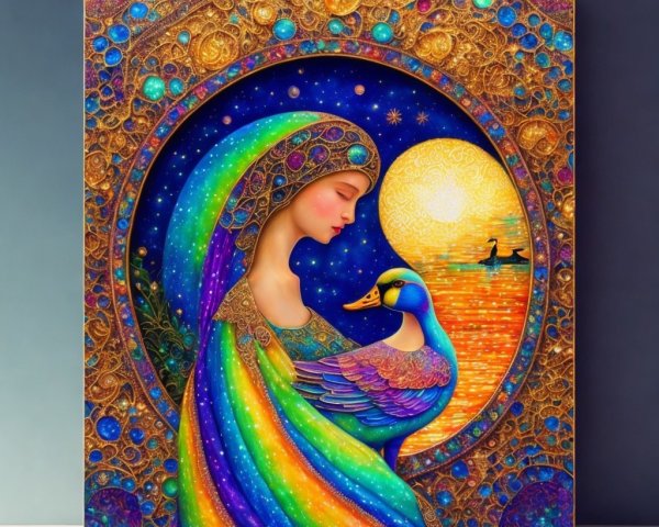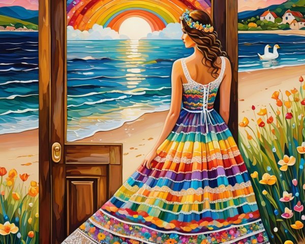A vibrant, colorful scene featuring a woman in a patchwork dress adorned with flowers, standing by a serene lake with a cute duck. A tree bursts with blossoms against a sunny backdrop.