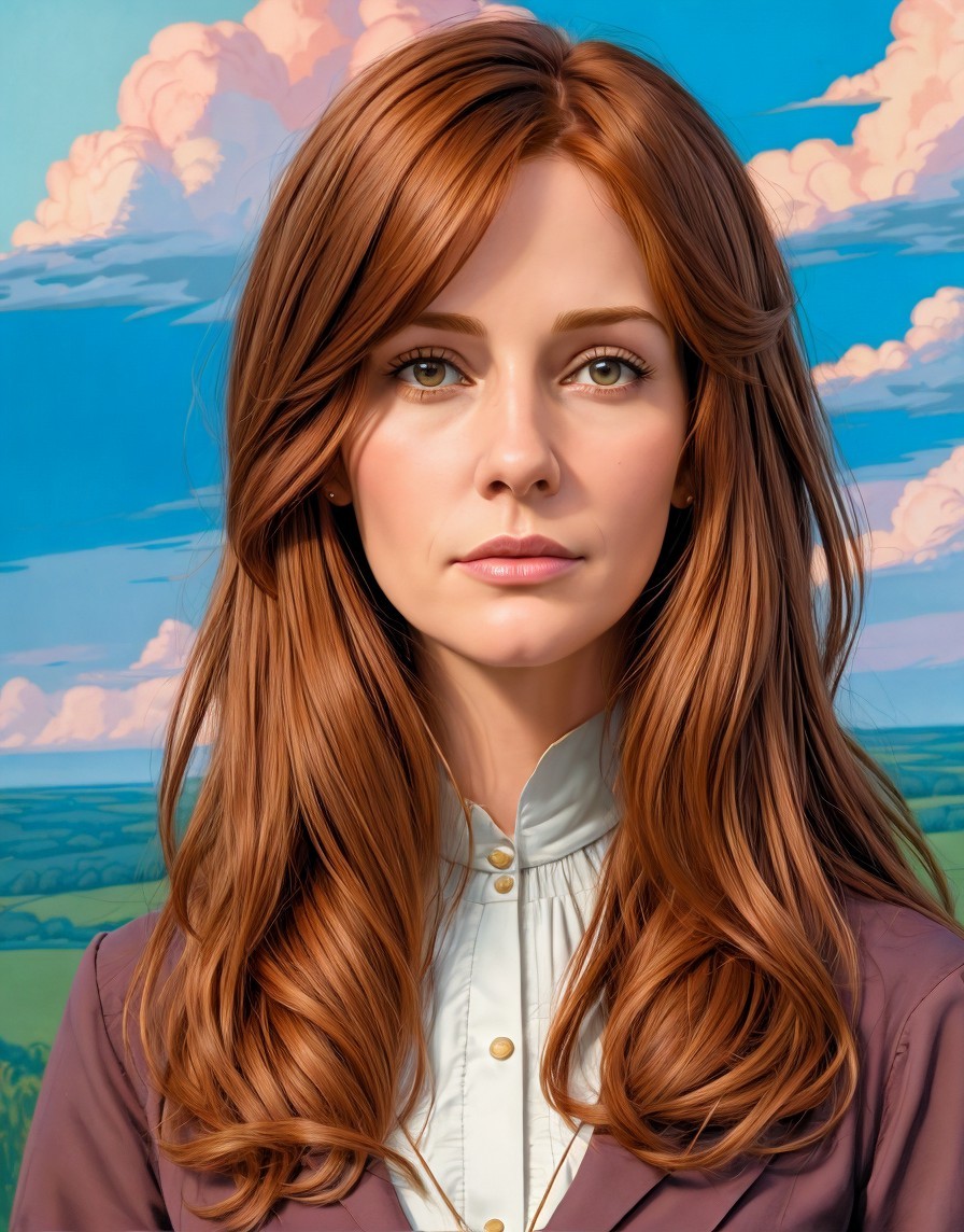 A woman with wavy auburn hair and green eyes looks forward, wearing a checkered shirt, set against a blue sky and green field.