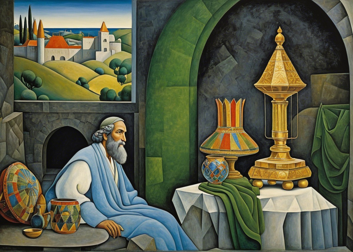 A stylized scene features a contemplative man in a blue robe, sitting in a mediaeval Italianate room with surreal animal elements, upper left a view of an exotic Eastern landscape