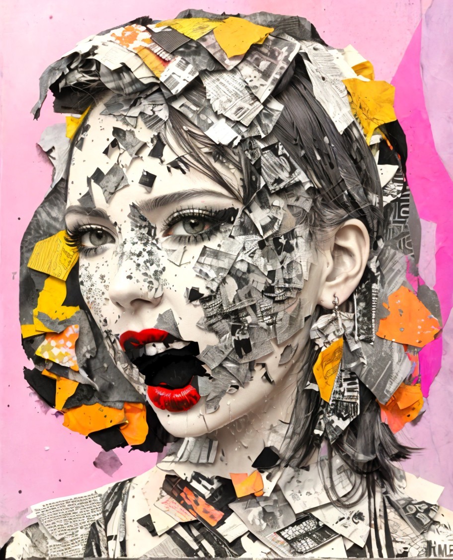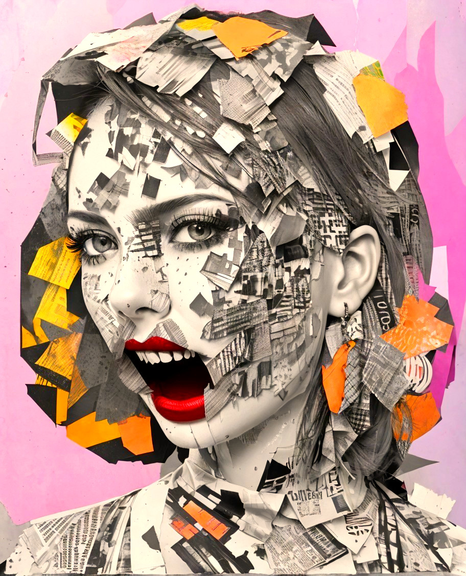 Portraiture using wet black ink, ink blots and charcoal, collage, mixed media, screaming female head consists of newspaper shreds, pointillism, embossed details, paper cuts patchwork, vibrant, hues of Woodblock print, tints of 3d linocut, upper body portrait style of Albert Gleizes and Tamara de Lempicka and Margaret Keane, wide-angle perspective, stacked lines, (triadic color scheme pink blue yellow, kinetic collage artwork), perfect handsface, cel-shaded, 7:5) tints of space age art, layered geometrical vector art, detailed brushed fields, intricate lineage, geometrical art, 3d effects 1.8, dynamic lighting, anisotropic filtering, brightness 1.2, brushed textures, stylized illustration 1.8, stacked strokes, maximalism, ((raytraced background, 3d effects), vector 9:7, radiance, brightness 1.3), detailed crackles, hairdo in Streamline_Moderne, stacked lines, stylized lineage, Schreger lines, embossed strokes, raytraced shadows 1.8, vibrant colors, high coloring 1.9, shadow mapping 1.9, octane render, cuteness, strict, serene, synthetic, anglo gothic 1.9, auracore 1.7, american gothic 1.9, high coloring 1.9, depth of field 1.7, tnts of movie poster art merged with marvel comic book art, quilling, soft edges, intricate lineage, comical plushy psychpomp scene, vector 9:5, digital artwork, octane render, plasticity 1.9, soft rounded edges, crisp quality, quilling,