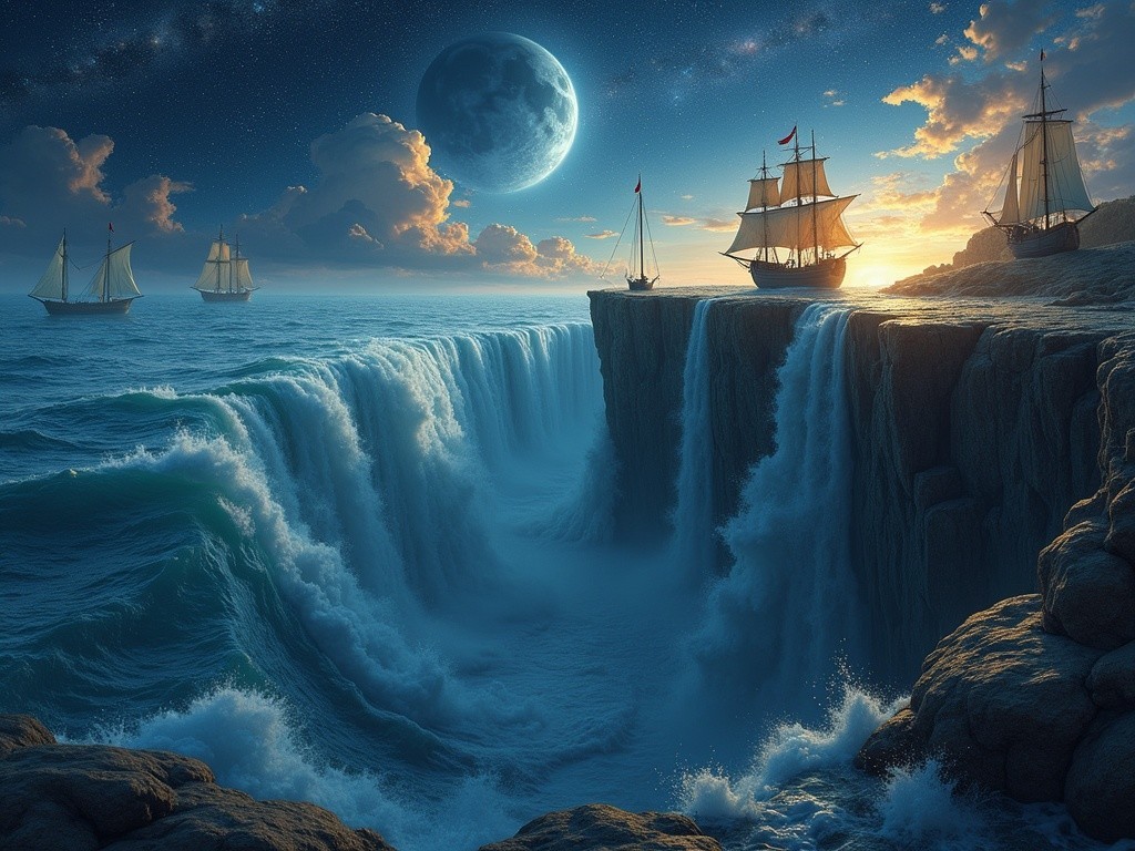 A fantastical sea with a ship approaching a swirling oceanic abyss, against a backdrop of towering cliffs and celestial bodies in the sky.