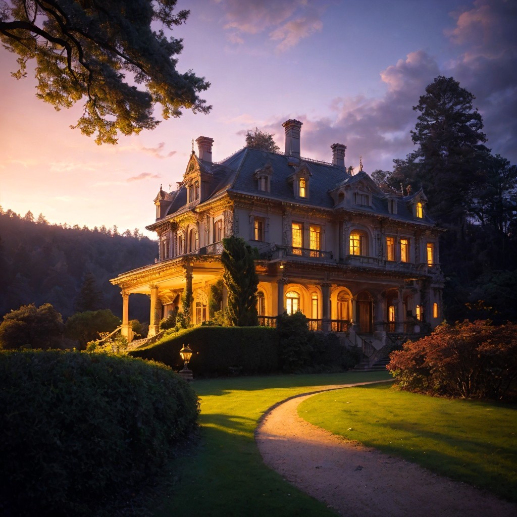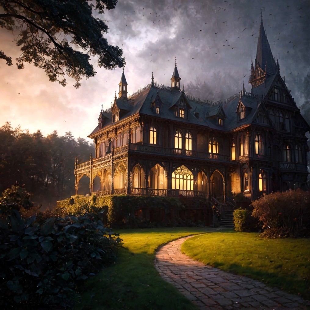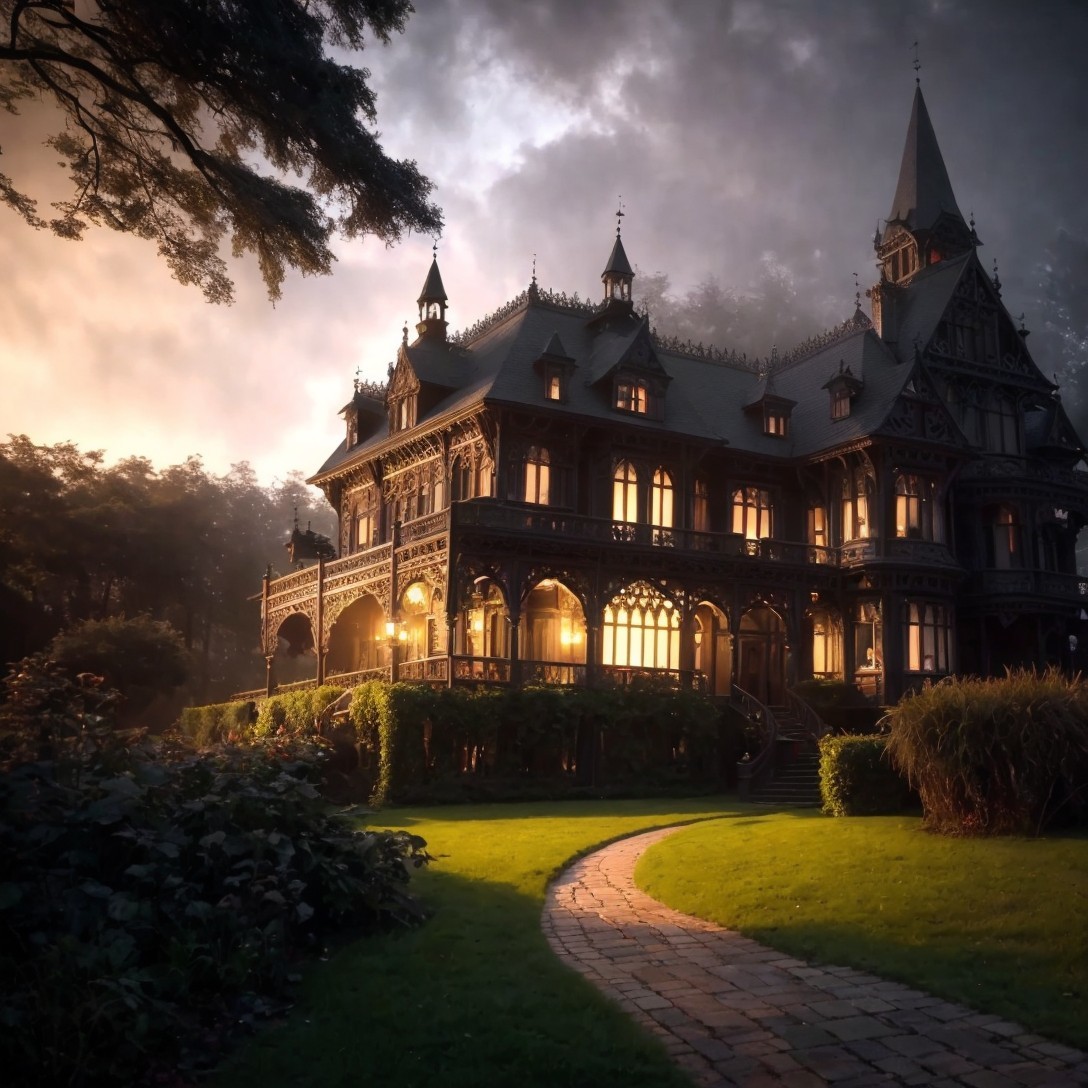 A grand manor house at dusk, with warm lights on, under a dramatic stormy sky with multiple lightning strikes.