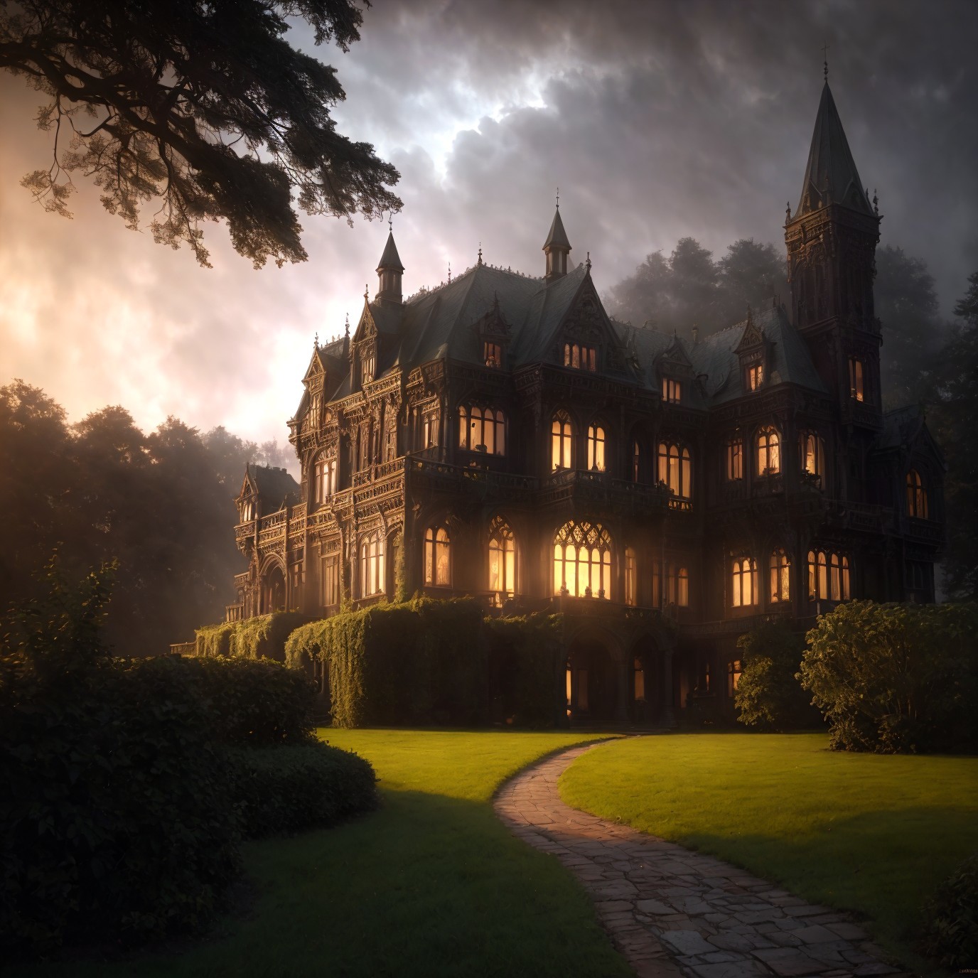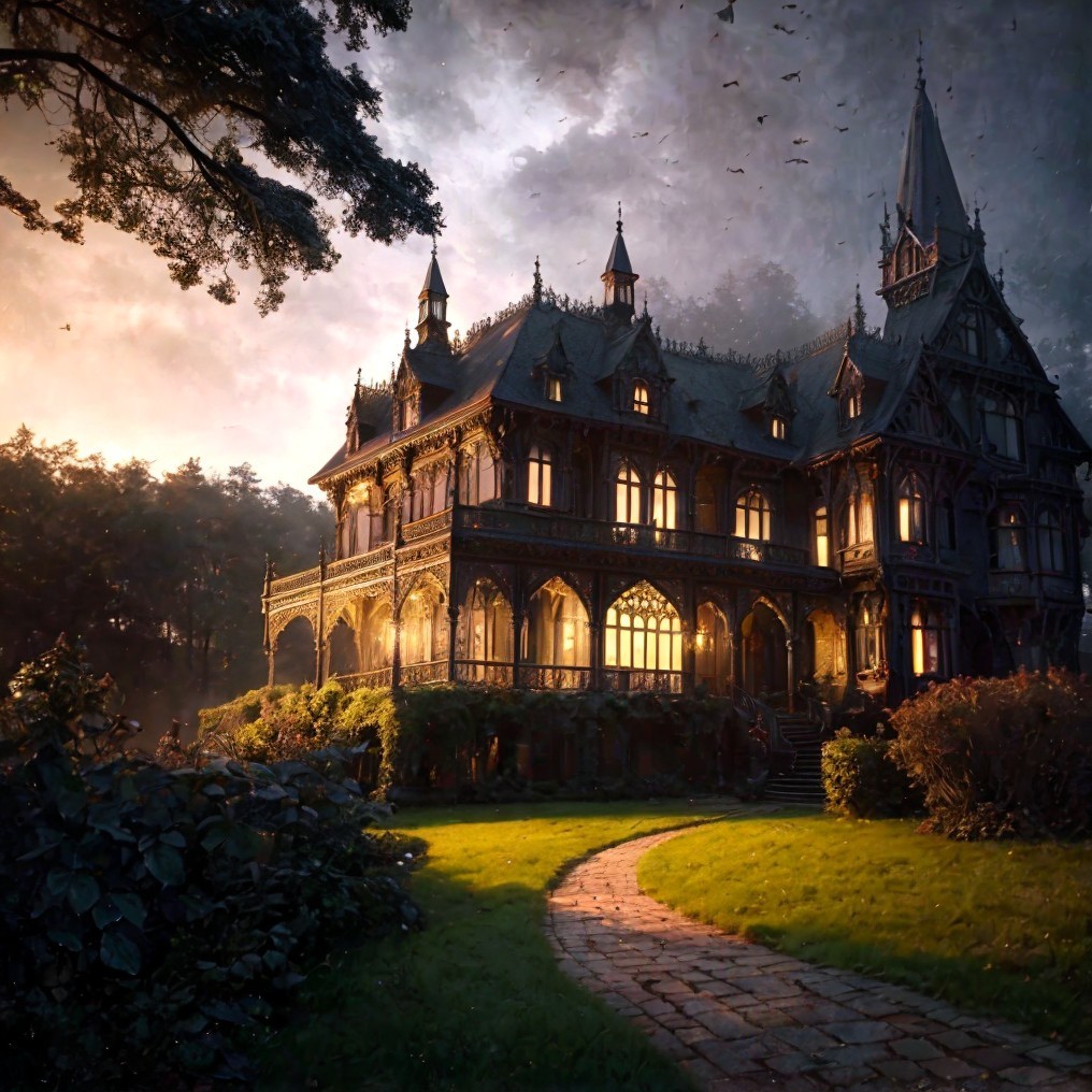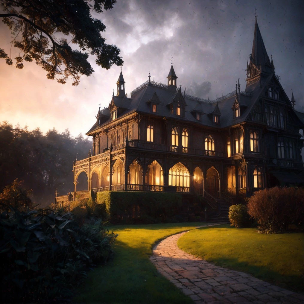 A grand manor house at dusk, with warm lights on, under a dramatic stormy sky with multiple lightning strikes.