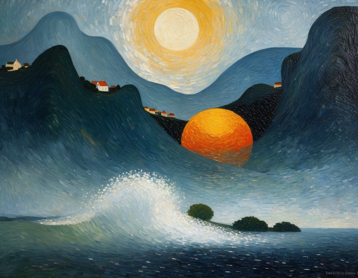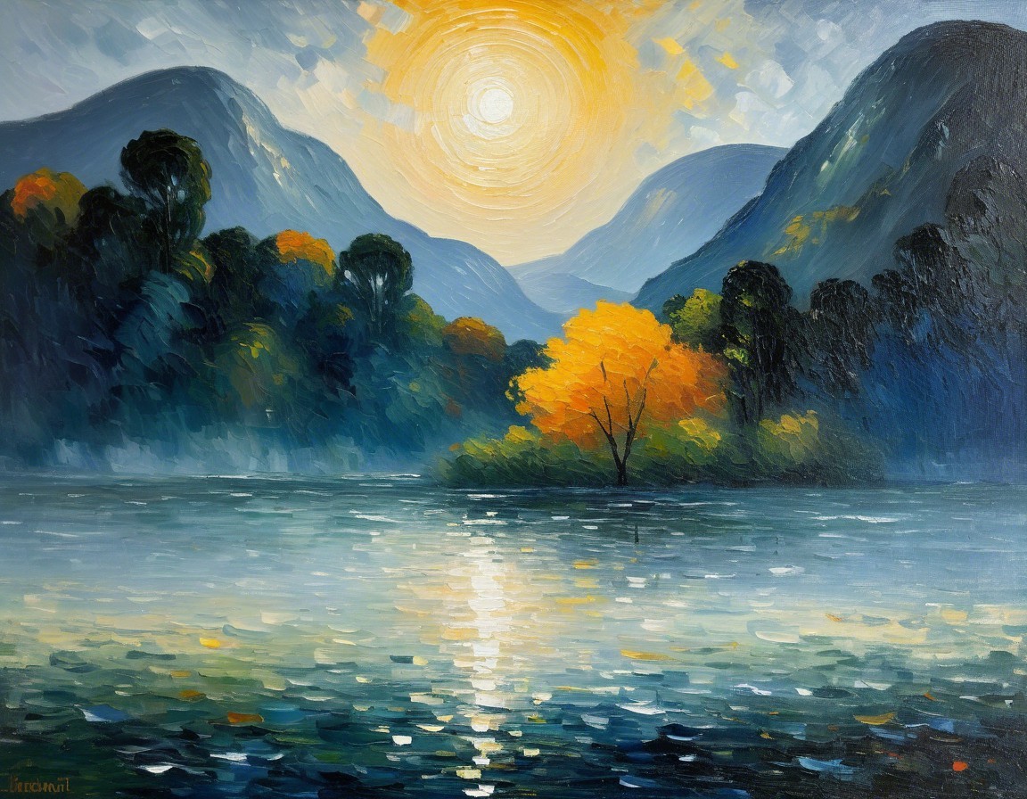 A serene landscape at sunset, featuring vibrant autumn colors reflected in calm water. Silhouettes of mountains and birds enhance the tranquil scene, with a lone duck gliding peacefully.