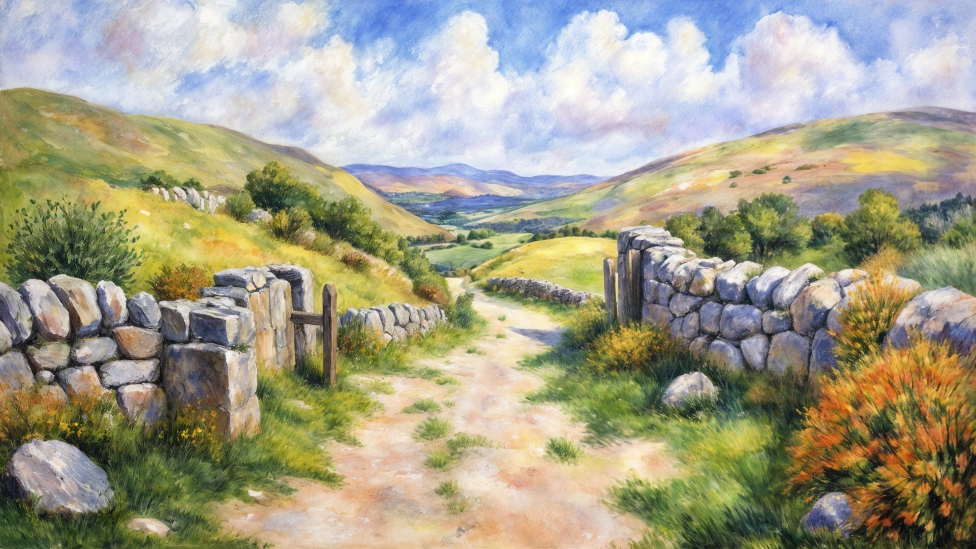 A picturesque landscape featuring rolling green hills, dotted with trees and wildflowers. A winding dirt road leads to a quaint white house, under a bright blue sky filled with fluffy clouds.
