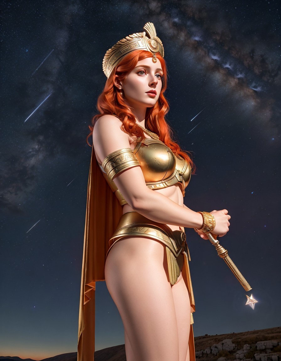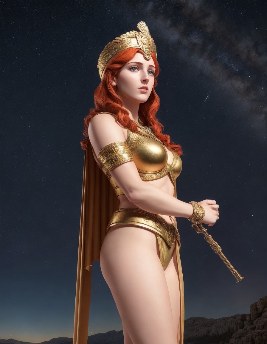 Prompt: "The Greek goddess Athena, beautiful redheaded woman, full body image, she is an ((android:1.3)), detailed night sky in background, highly detailed"