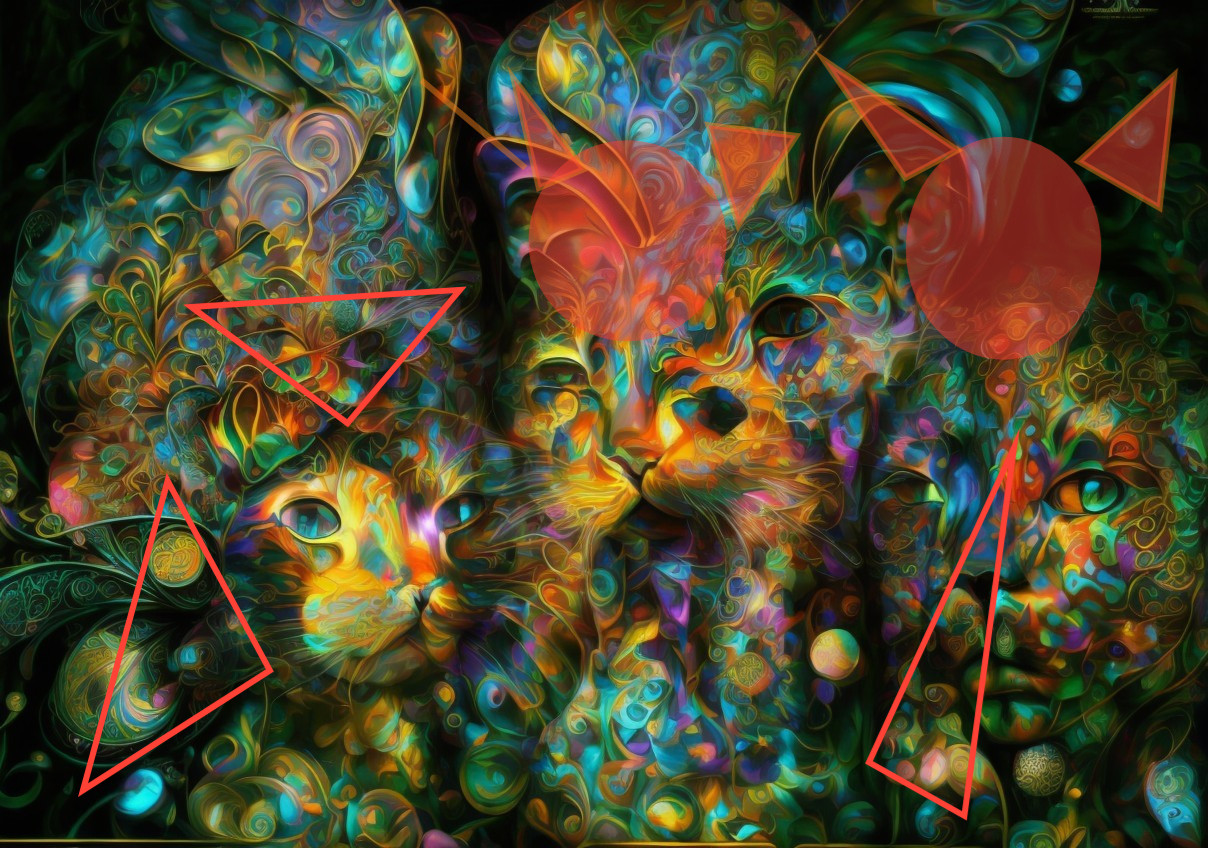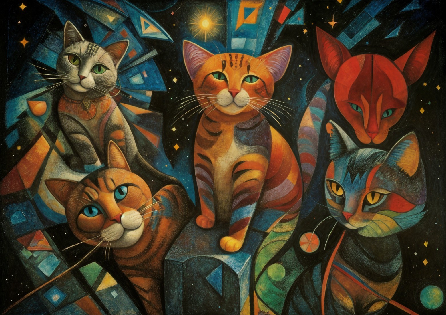 A vibrant artwork featuring stylized cats in various colors and geometric shapes, set against a cosmic backdrop with stars and planets, evoking a whimsical and enchanting atmosphere.