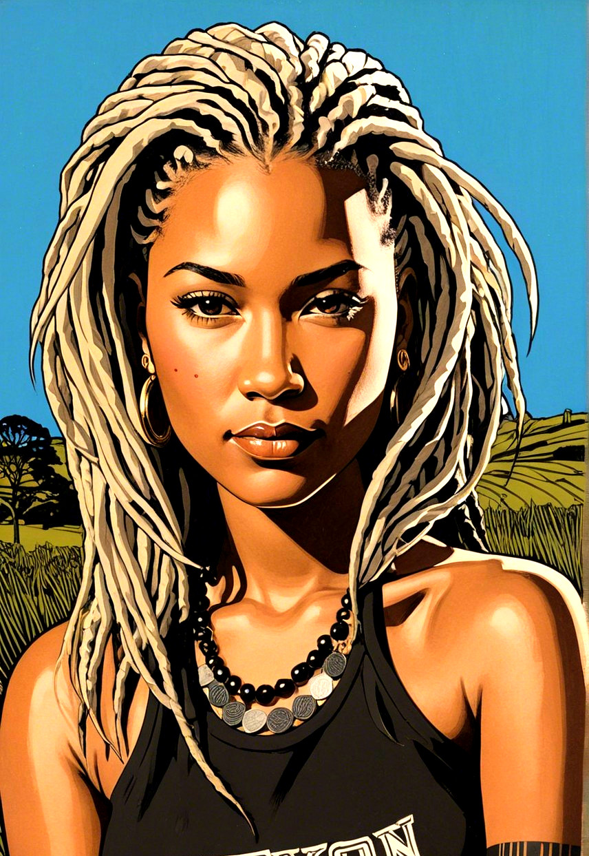 Stylized woodblock print, upper body Portraiture with aura, Dreadlocks, shirt with tribal patterns, buxom, american gothic 1.2, complexion 1.7, harlem renaissance style, natural details, traumacore 1.2, squiggly calligraphic lineage, saturated, stylized by Overton Loyd, tints of Ho baron and stan lee, Paint overspray, hues by Edward Hopper, 3 point lighting in Emshwiller's style, cloud flares, abstract style, warm colors, dark sky, soft lighting in deep textures, precise Gelsculpt 64K rendering, nuanced, bokeh effects 1.5, stacked lines, stippled, anisotropic filtering 1.7, american gothic 1.7, octane render illustration 1.5, parallax occlusion 1.2, fantasy art inspired by Paul kidby, parallax occlusion 1.2, octane render illustration 1.5, 3d effects 1.8, saturated colors 1.7, eroticism, tetradic color scheme green ochre brown auburn, tessellated, hues, close-up, dark green, marinism, stippled, Handsome long hair, gothical, soft rounded edges, misty, blurred, color glitch, quilling, high coloring 1.3, complexion 1.4, brightness 1.9, shadow mapping 1.3, ,raytraced shadows 1.8, pastel colors, dappled dynamic lighting, stylized, (woodblock print (triadic color scheme beige, ochre, amber) 7:11), perfect handsface, costume jewelry details, squiggly line-art features, tiny reflections, high illumination, intricate hairstyle), tints of gouache, 5:11), plasticity, auracore, 3d effects, anisotropic filtering, 1970s advertising art, 3 layers of dof, dethereal, colorful hues, plasticity 1.6, radiance, divisionism, retrofuturistic, natural details, traumacore 1.2, synthetic, quaint, joyful, occult, retropunk, uhd,hdr, octane render illustration 1.5, streamline_moderne, synthetic, eroticism, revealing, stacked-up perspective, charcoal textures 1.7, stylized heroine in style of Barclay shaw, juvenile beauty, textured skin, intricate, soft delicate coloring, overall composition by Didier Lourenço and frank Fazetta and stan lee,