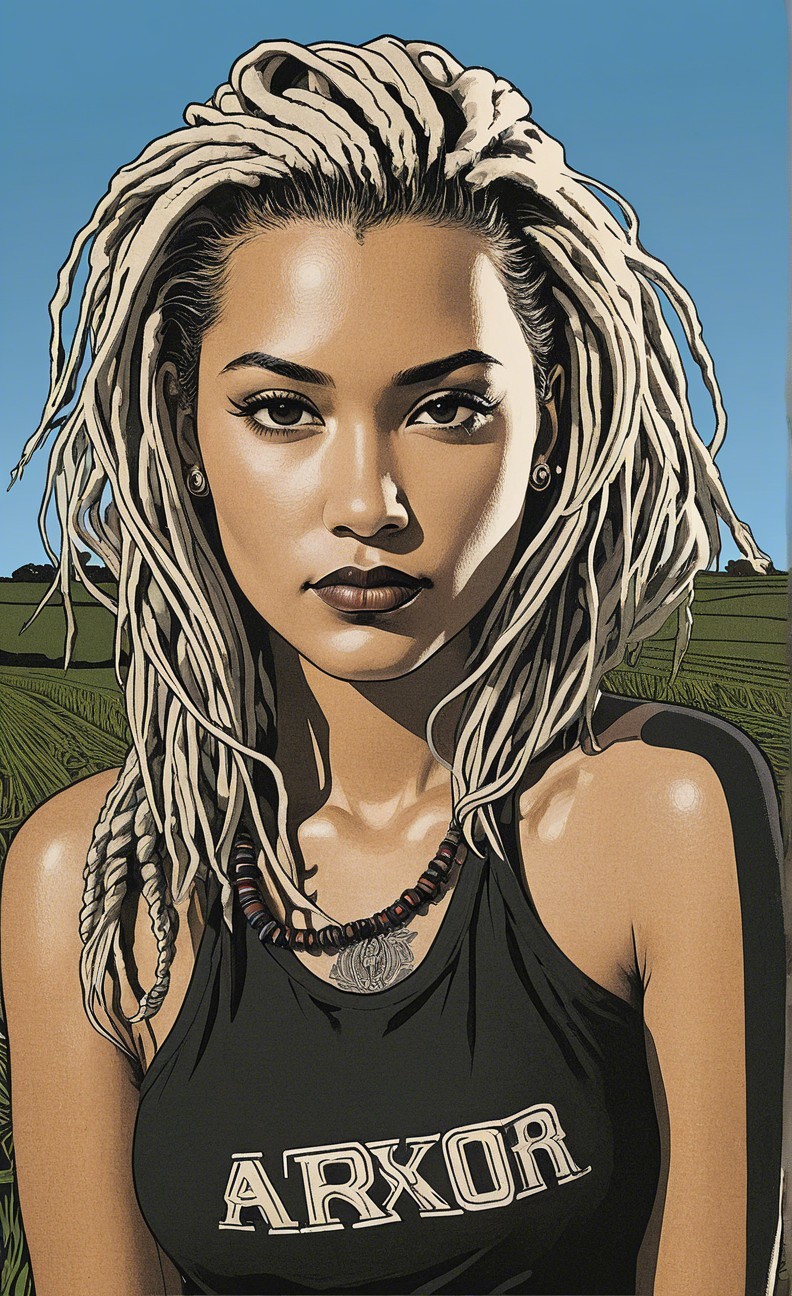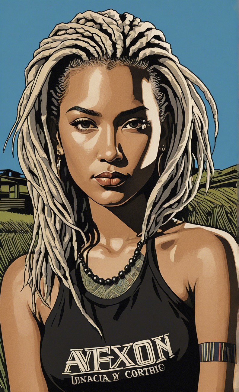 A portrait of a young woman with long, blonde dreadlocks and striking features, wearing hoop earrings and a necklace, set against a vibrant blue backdrop and a serene landscape.