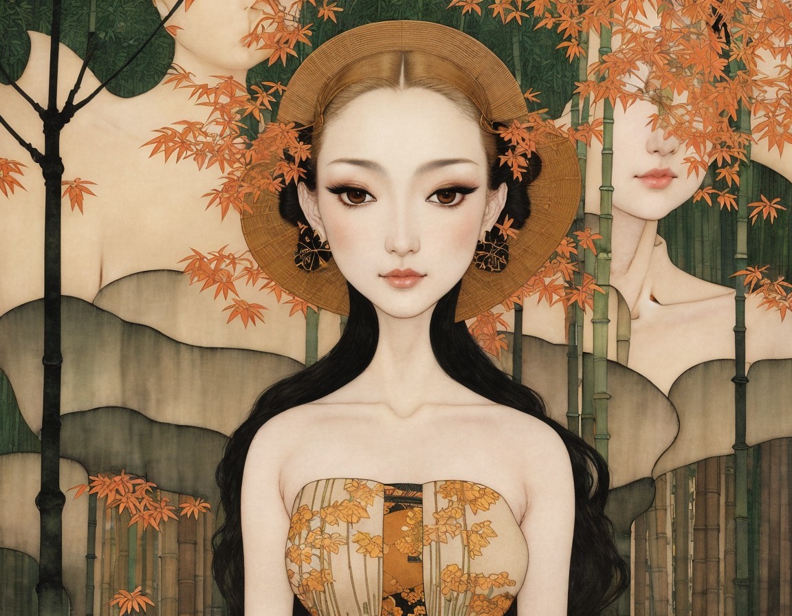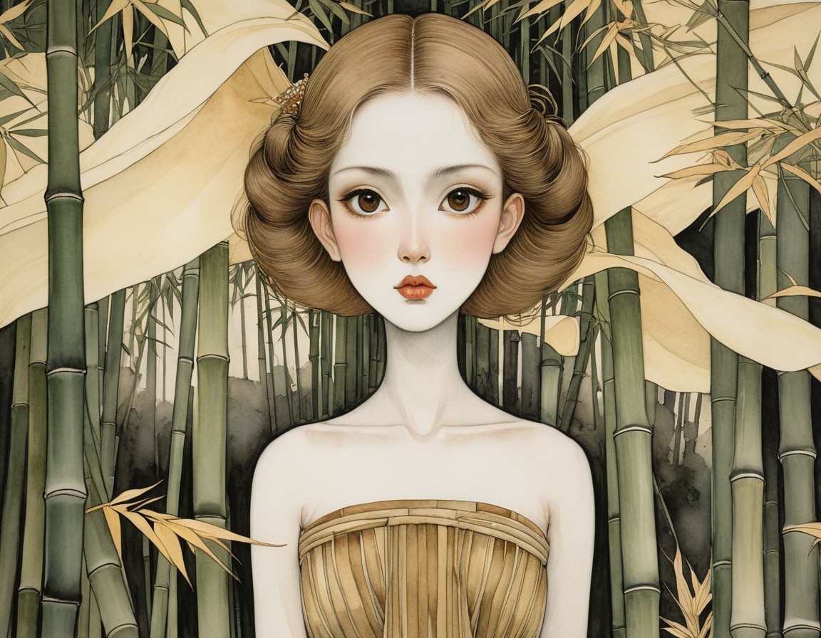 An illustrated portrait of a woman with an ethereal look, set against a bamboo background, showcasing intricate detailing and soft colors.
