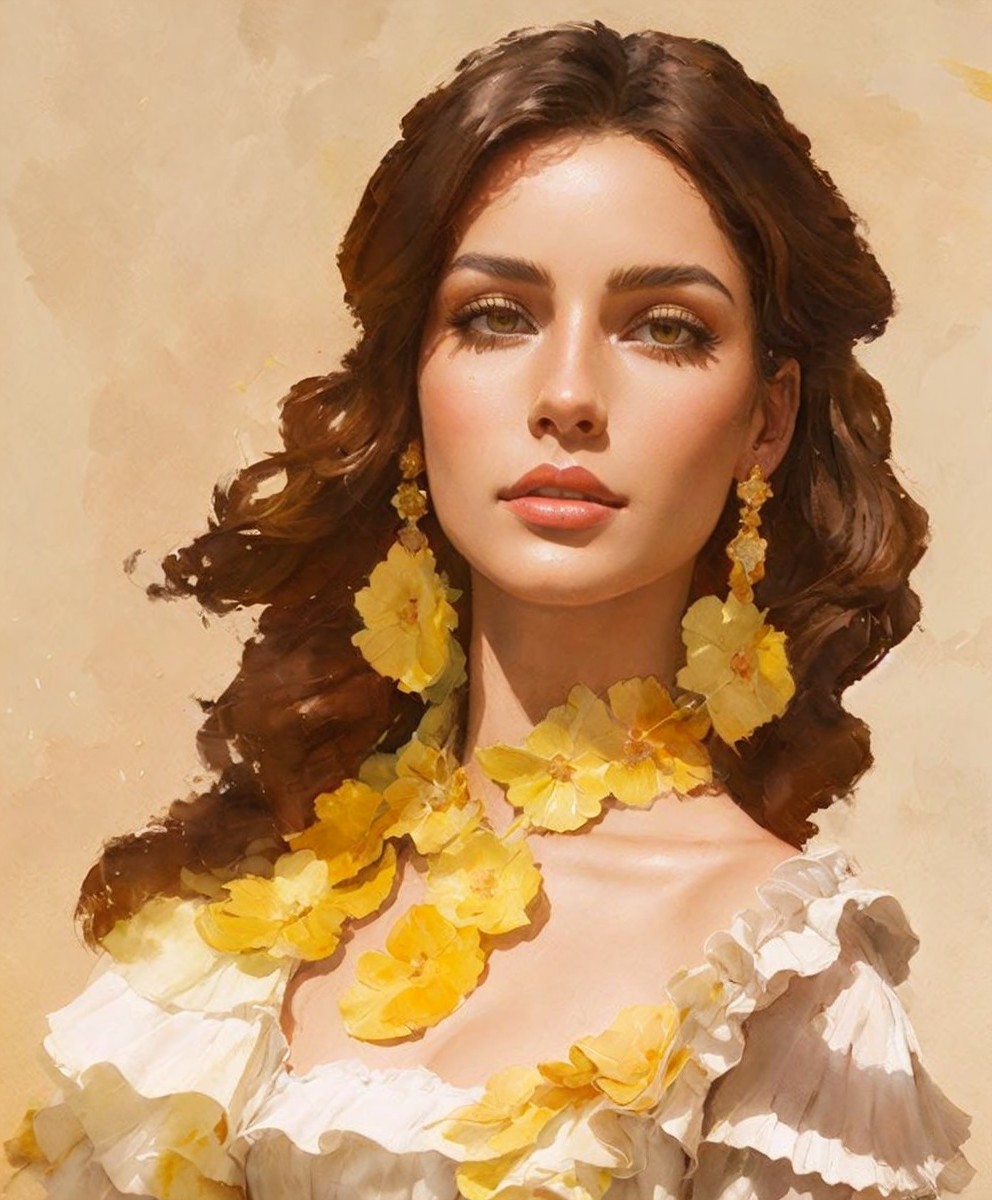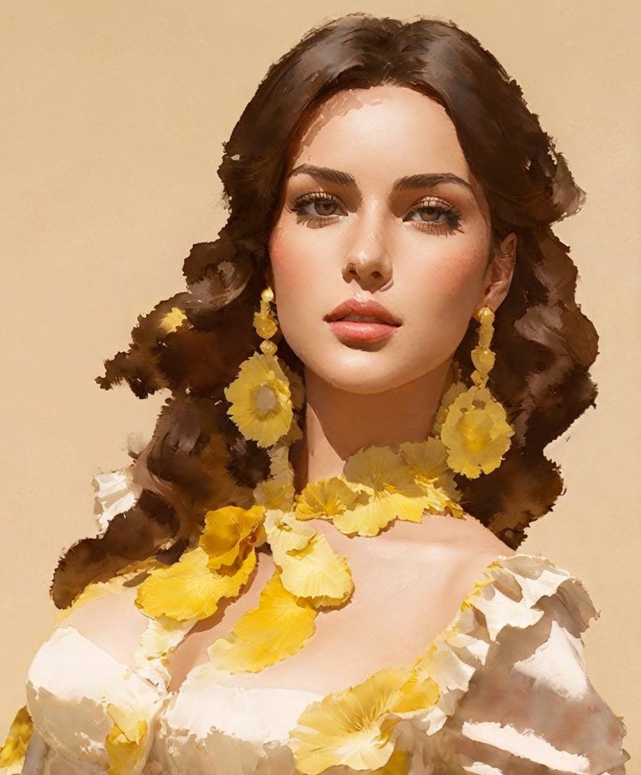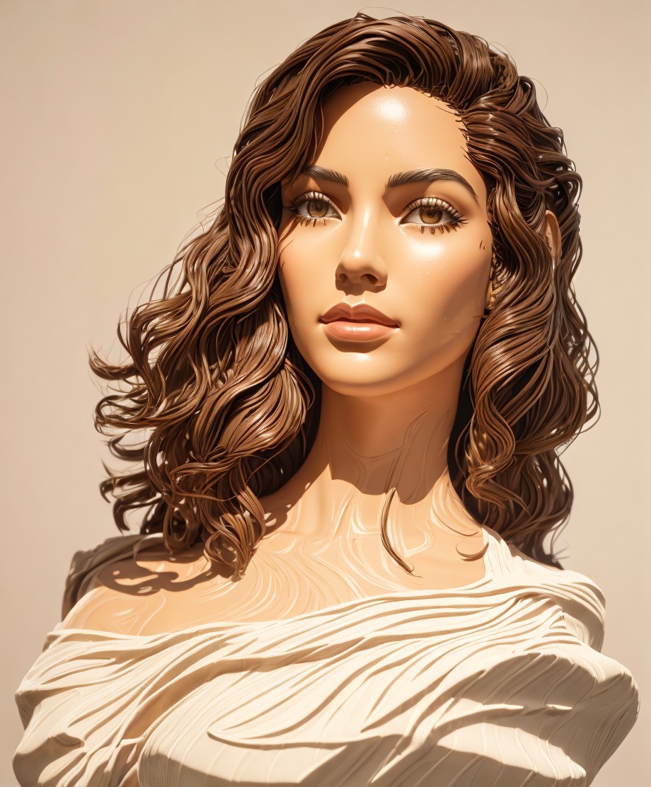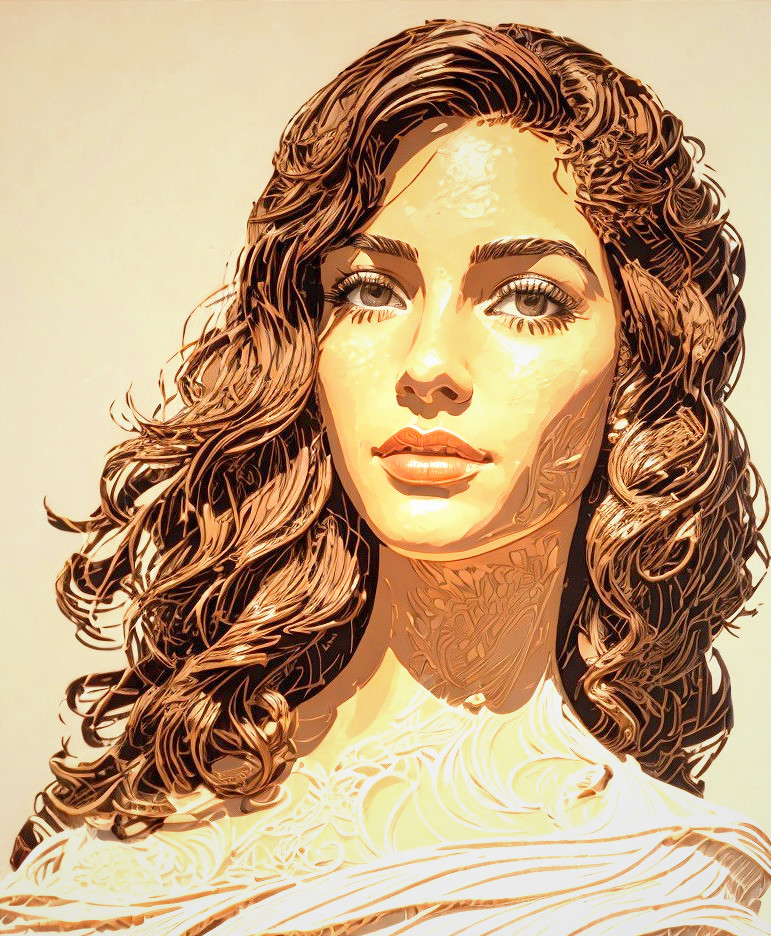 3d linocut, Portrait of beautiful woman with brown curly hair, thick raised impasto and bold lines, 3d effects 1.8, detailed lineage, synthetic, tints of Sonja Lera Preston, chaotic lineage in background, smooth crackles, ambient occlusion 1.5, zentangle style painting, concept art, Art Nouveau portraiture, stylized Woodblock print, detailed lineage, triadic color scheme brown yellow black, embossed with crackles, high coloring 1.9, tints of 1950s advertising art, 3d art, Synthetic essence, tints of 1970s fantasy art, subsurface scattering 1.7, back-lit, effects 1.8, streamline_moderne, anisotropic filtering 1.7, intricate details, vibrant strokes, maximalism, radiance, highly detailed ornamental features, illustrative style, radiance, maximalism, octane render, vector 9:7, soft edges, light hues, highly chipped background, luminous, saturated colors 1.5, geometrical, stacked lines, bold lines, vibrant lineage, smooth lines, intricate details of lineage, raytraced shadows 1.8, sublime, mood, eroticism, brightness 1.9, detailed illustration, stylized painting 1.7, beautiful composition 1.9, tints of instaport style