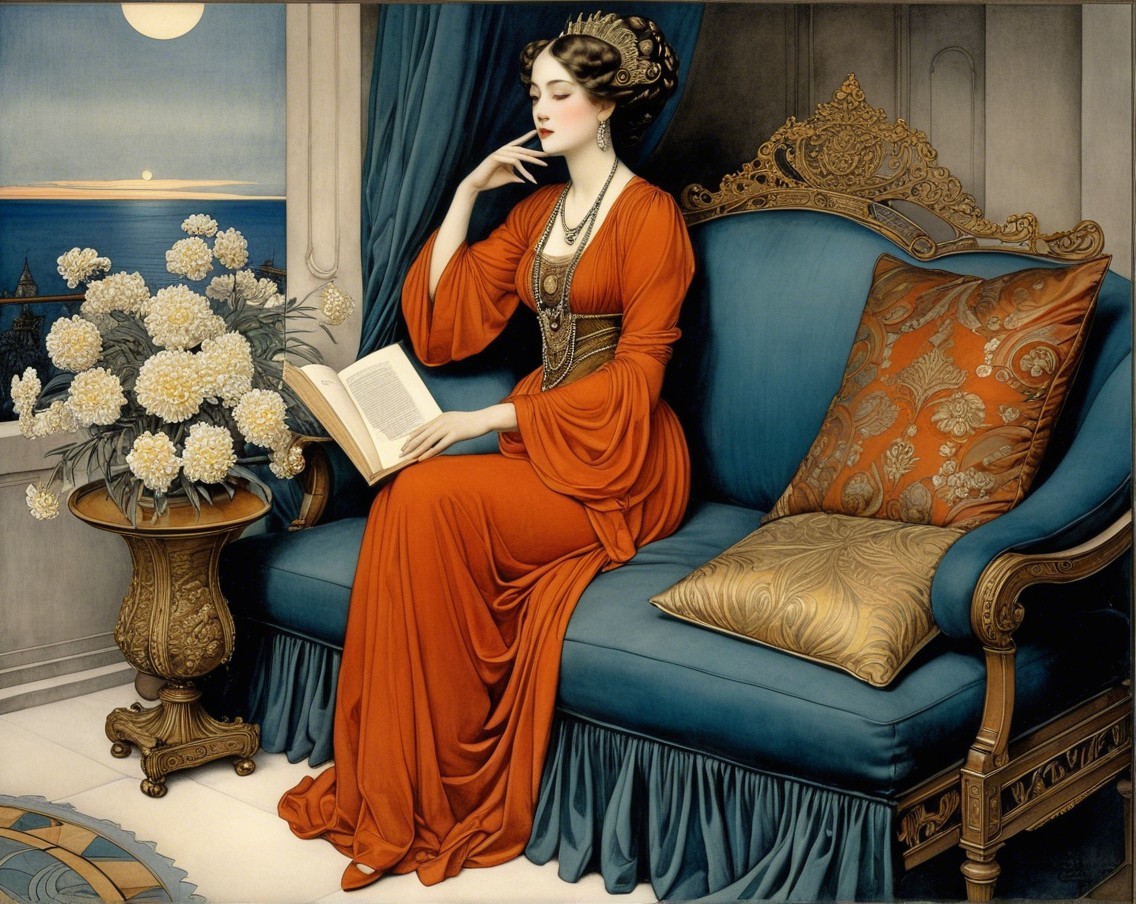 A woman in a flowing orange gown sits gracefully on a crescent moon, surrounded by stylized trees and golden flowers. The night sky is dotted with stars and crescent shapes, creating a serene ambiance.