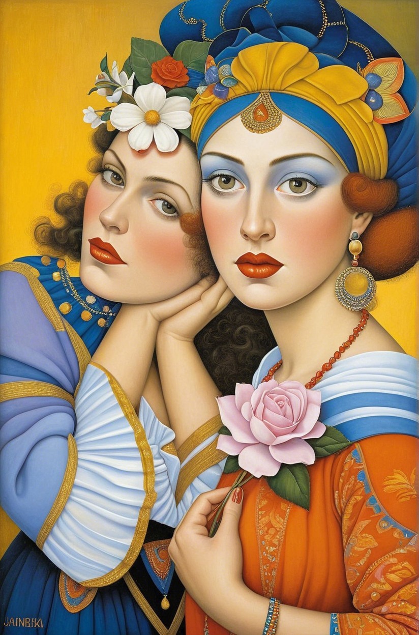 Two women with striking features and bold makeup pose closely. One wears a floral headpiece, while the other sports vibrant traditional attire. Bright colors and soft expressions create an elegant atmosphere.
