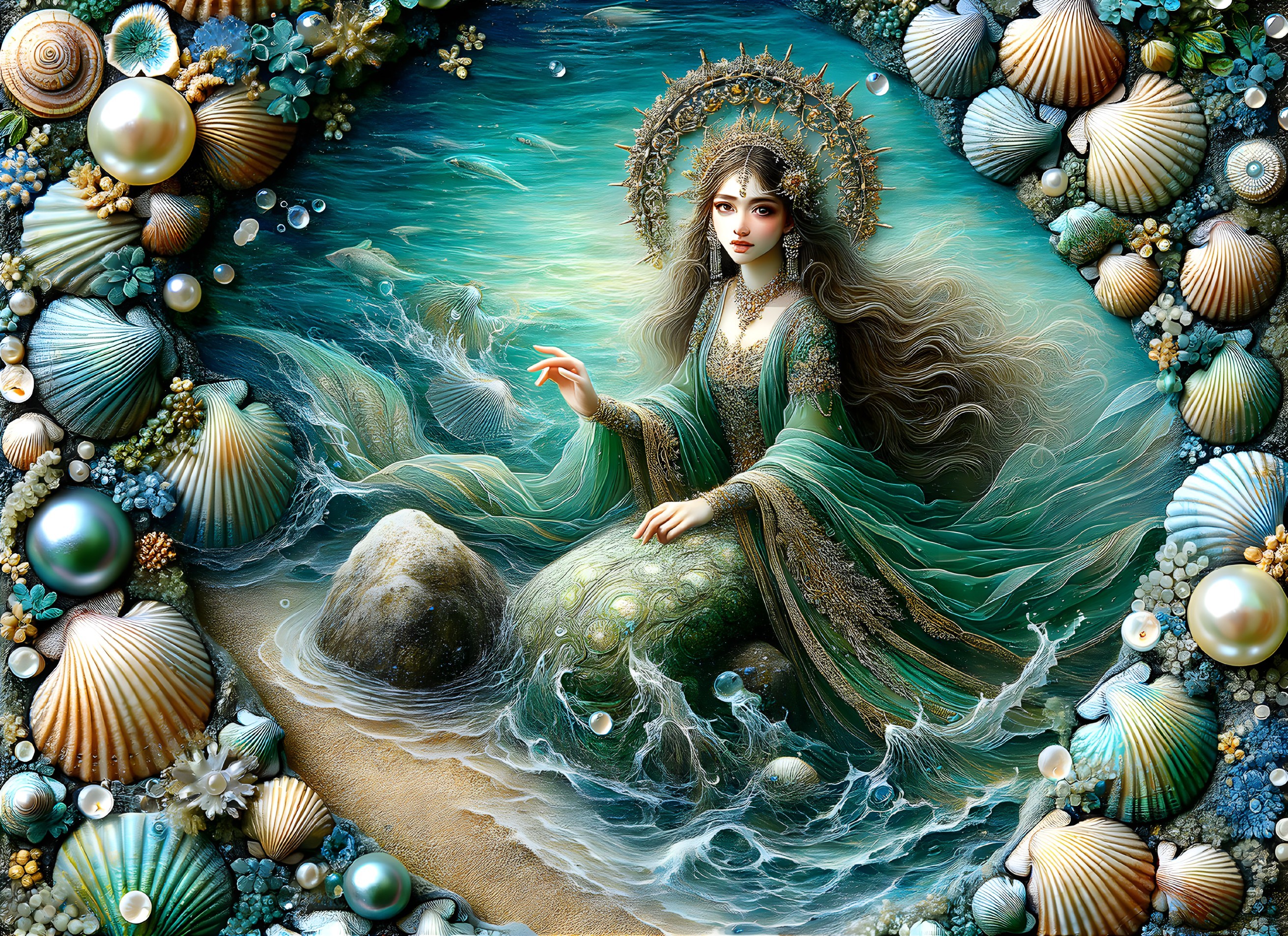 A mesmerizing artwork depicts a sea nymph turning into a stunning mermaid on a rocky shore. The piece features a tranquil ambiance with aqua-sand hues, pearl details, and seashell motifs, radiating an ethereal and fantastical allure.