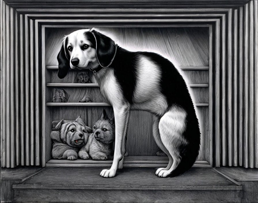 Monochrome artwork featuring three gothic characters with exaggerated features in a surreal, intricate frame.