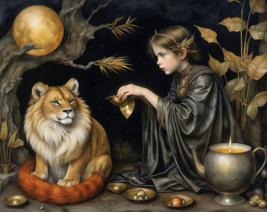 A serene scene depicts a young girl gently interacting with a lion under a moonlit sky. Butterflies flutter around, while a bird perches on a nearby tree, creating a magical atmosphere.