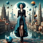A woman in a stylish blue outfit stands on a checkerboard, flanked by whimsical architecture and hot air balloons, against a backdrop of surreal landscapes and a giant turquoise sphere.