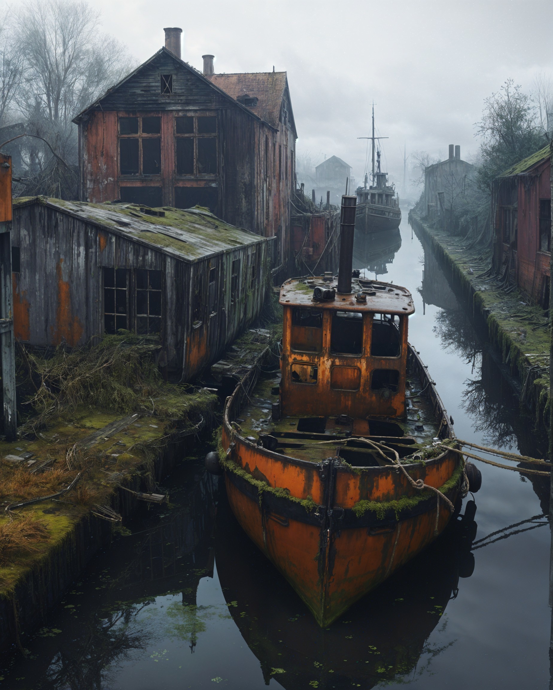 A misty, abandoned waterways scene features decaying wooden houses and a rusted boat, surrounded by overgrown vegetation, evoking a sense of desolation and time's passage.