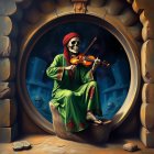 A young woman in a flowing green dress sits on a stone arch, holding a book. Soft light from lanterns illuminates the misty, enchanted setting, creating a serene and mystical atmosphere.