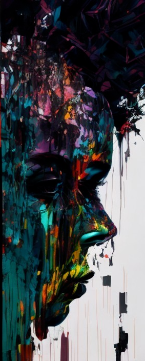 Abstract, colorful painting of a fragmented, dripping face with a dark background.