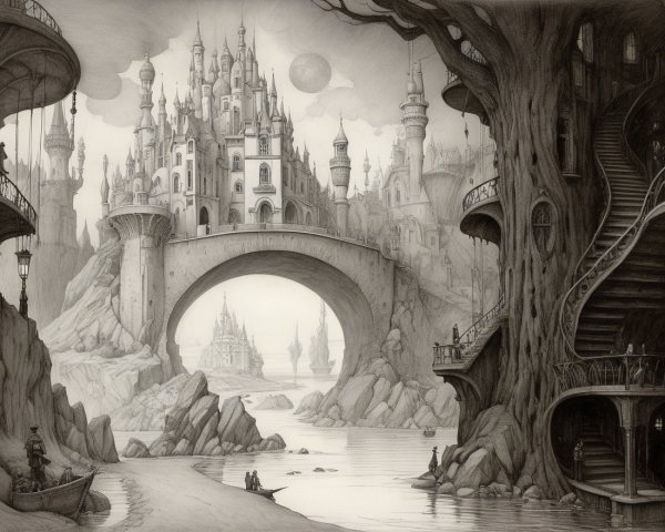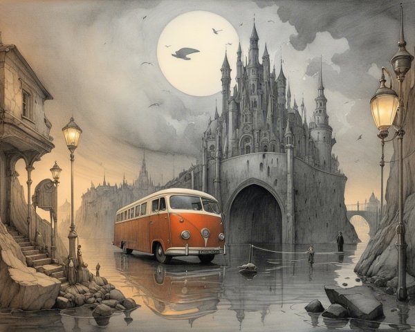 A majestic wolf's head emerges from a smoky backdrop, its piercing eyes glowing, as shadowy figures gather around a distant fire under a crescent moon, creating a mystical, dreamlike atmosphere.