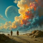 Two figures stand on a dusty path, gazing at a vibrant sky filled with fluffy clouds and a large planet. A dog accompanies them, adding a sense of companionship to the serene landscape.