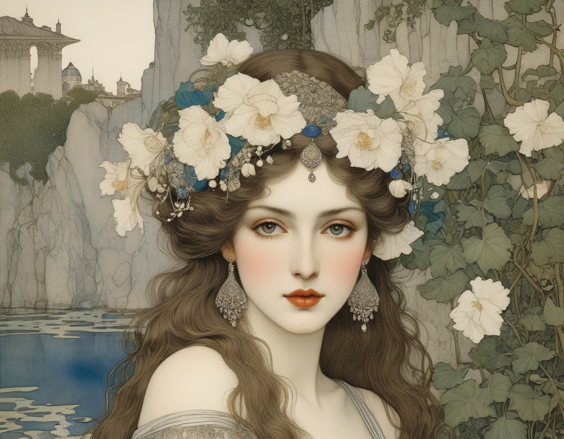 A classical portrait of a woman with flowers in her hair, set against an architectural and botanical backdrop.