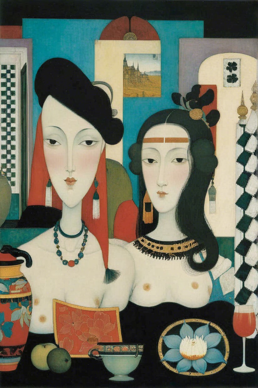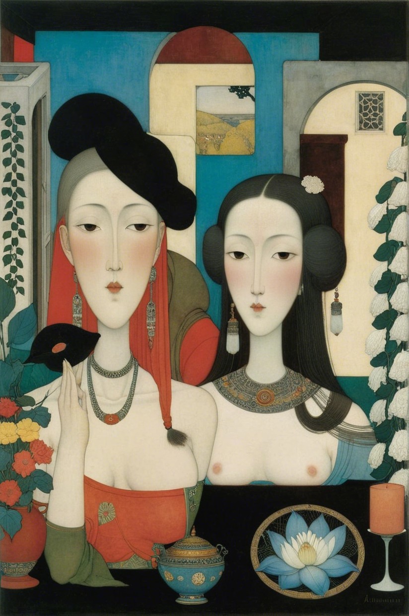 Two elegant women are depicted in a vibrant, decorative setting, surrounded by flowers and traditional elements. One wears a striking red outfit, while the other dons a soft blue gown, creating a serene atmosphere.