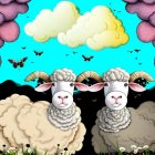 Two cartoonish sheep stand in a vibrant landscape, surrounded by colorful trees and flowers. The sky is a dramatic mix of blues and purples, adding a whimsical, playful atmosphere.