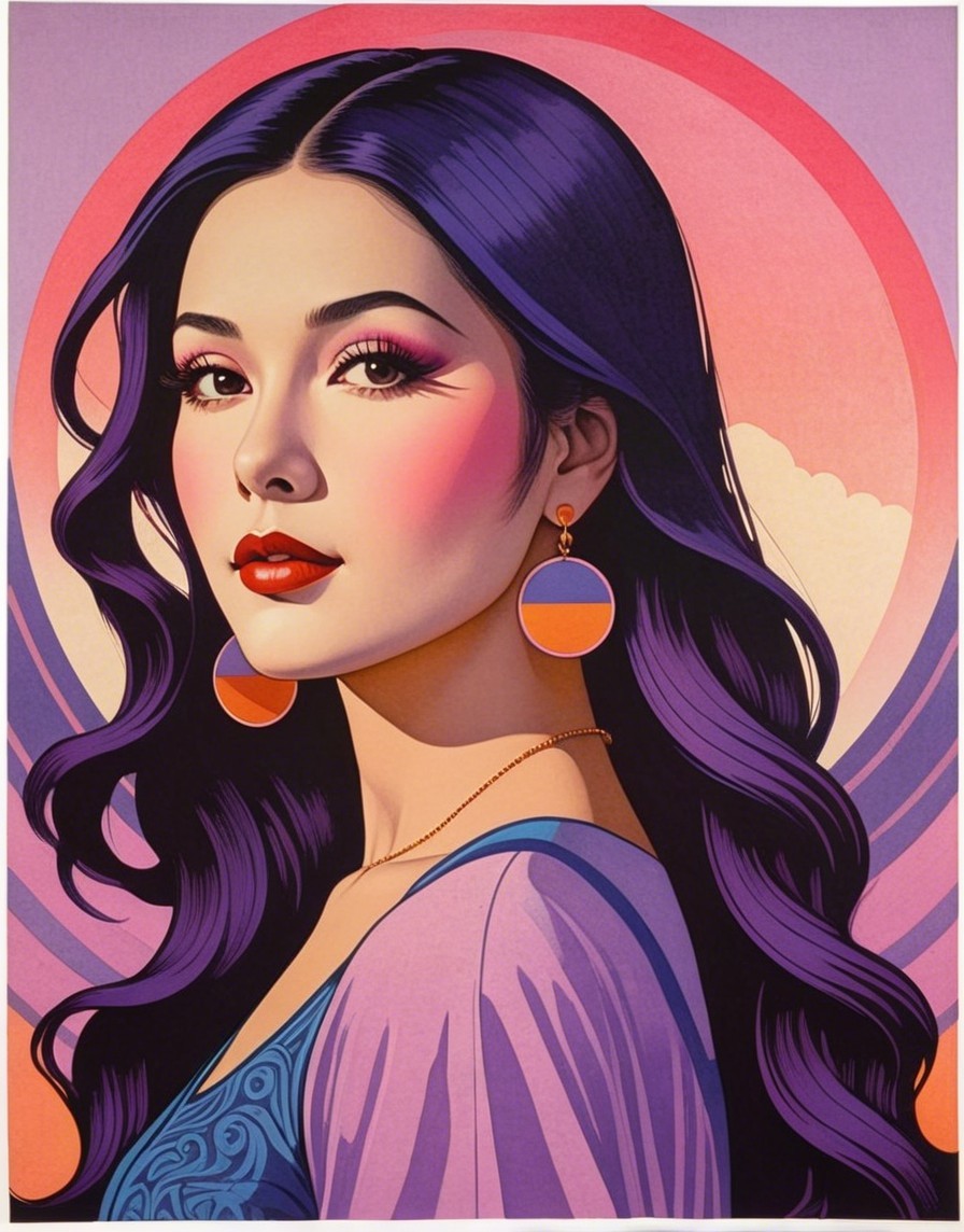 The image features a striking woman with long, flowing purple hair and bold makeup. She wears decorative earrings and a colorful outfit, set against a vibrant, stylized background.