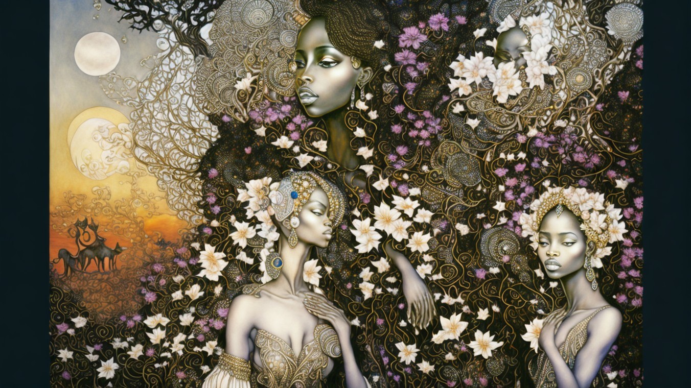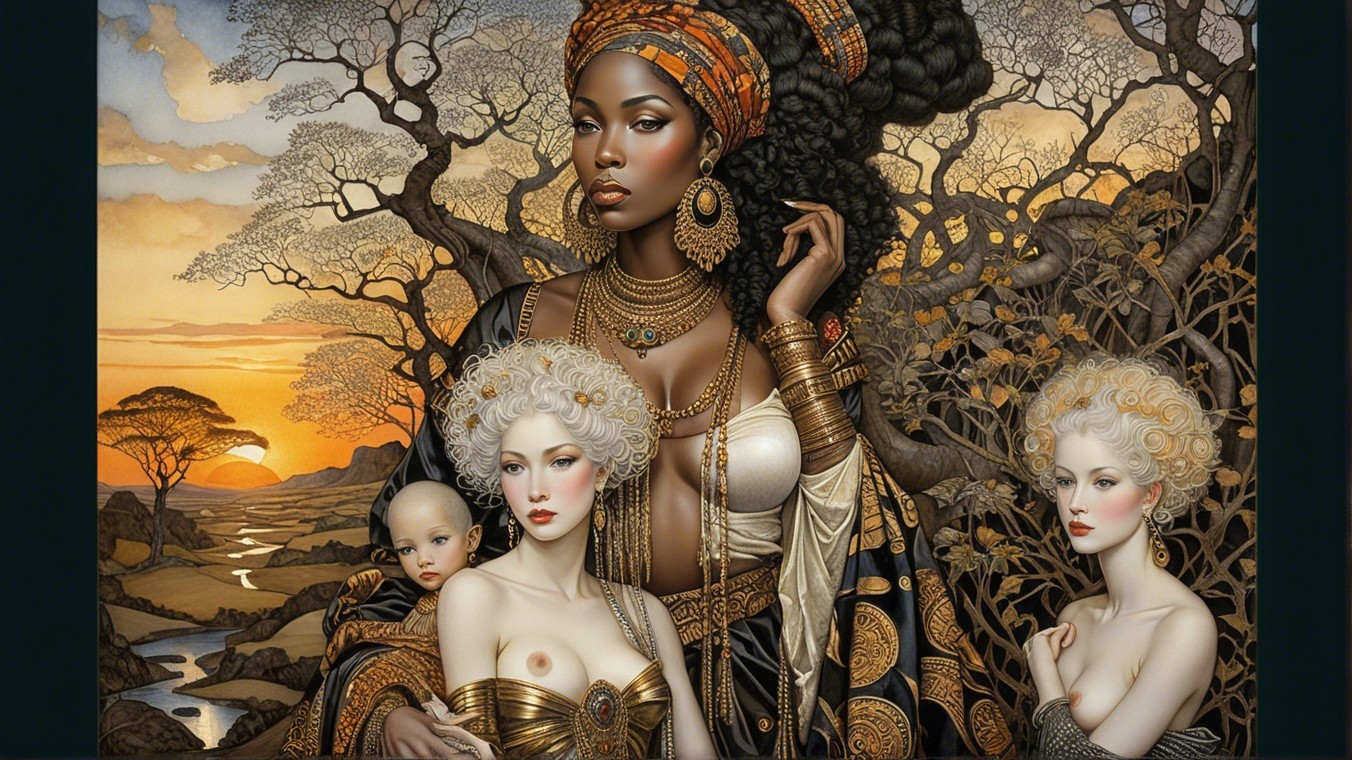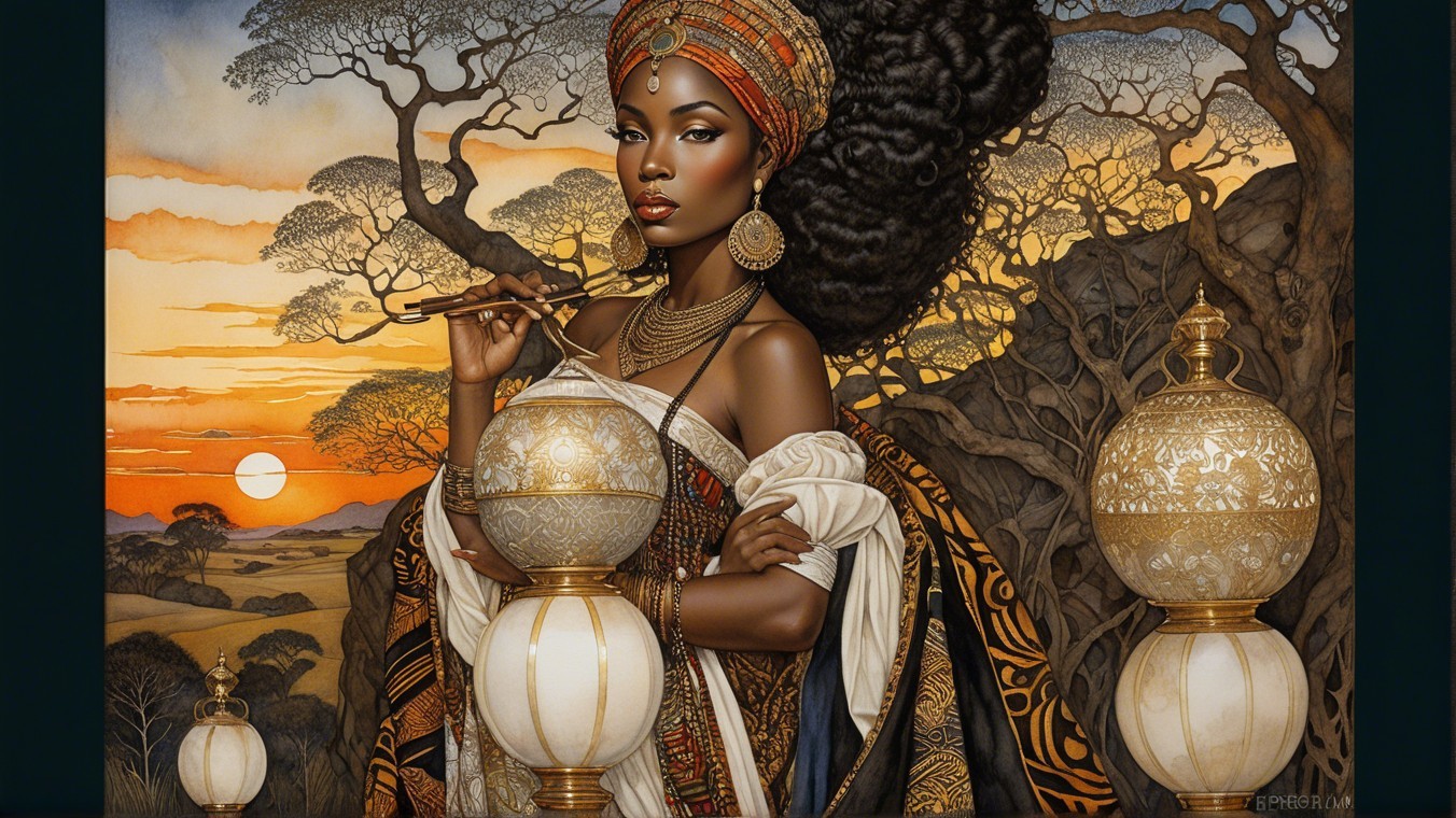 A regal figure with a striking headdress and intricate jewelry stands against a vibrant sunset. Her attire features bold patterns, complementing the serene landscape of acacia trees.