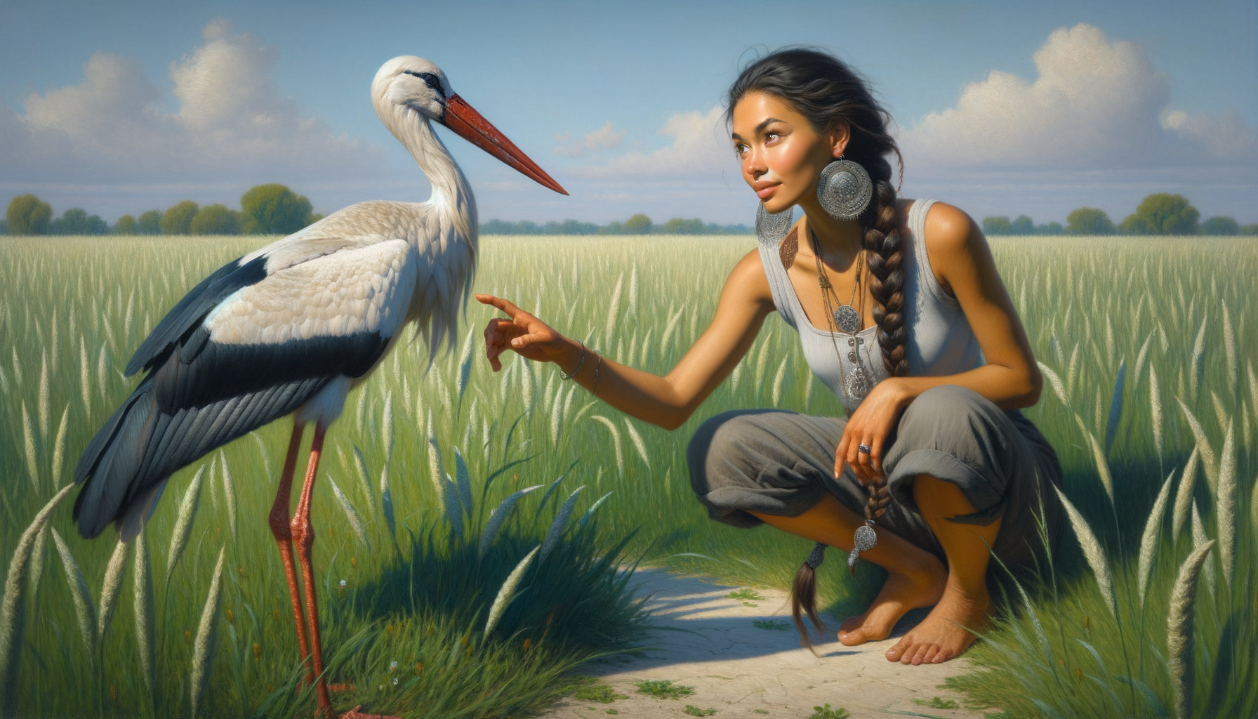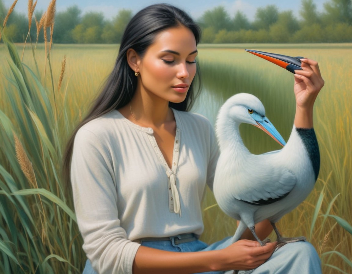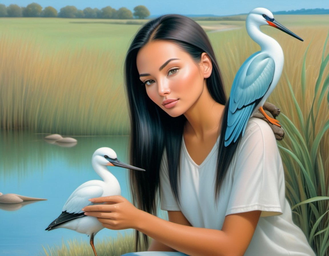 A digital artwork of a woman with sleek hair and a white bird, set against a serene lake, with mountains and flying birds in the background.