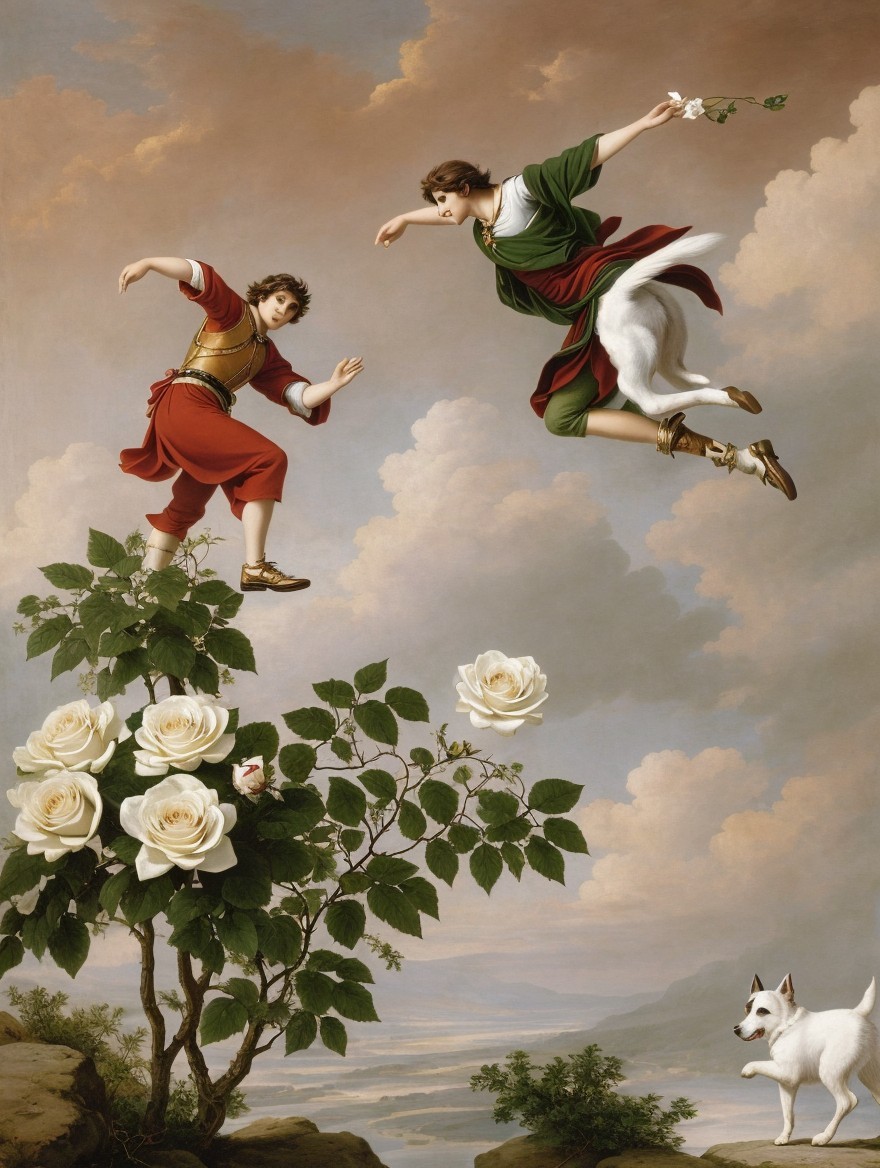 A person in a white shirt and brown pants leaps dramatically from one cliff to another, holding a flower, as another person and a dog watch.