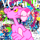 A vibrant artwork featuring a young woman in a pink, polka-dot outfit. Her long hair flows dramatically, surrounded by a colorful backdrop of sun, rainbow, and swirling patterns, evoking a dreamy, magical atmosphere.