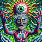 The image features a vibrant, surreal figure with multiple eyes, reaching out amidst intricate patterns and bright colors. An oversized eye above emanates rays, enhancing the psychedelic theme.