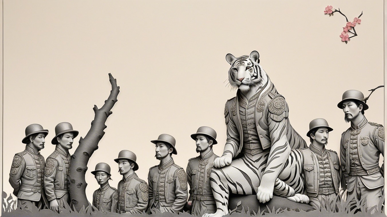 A majestic white tiger sits gracefully among intricately designed flowers and branches, set against a soft, neutral background, showcasing a blend of nature and artistic creativity.