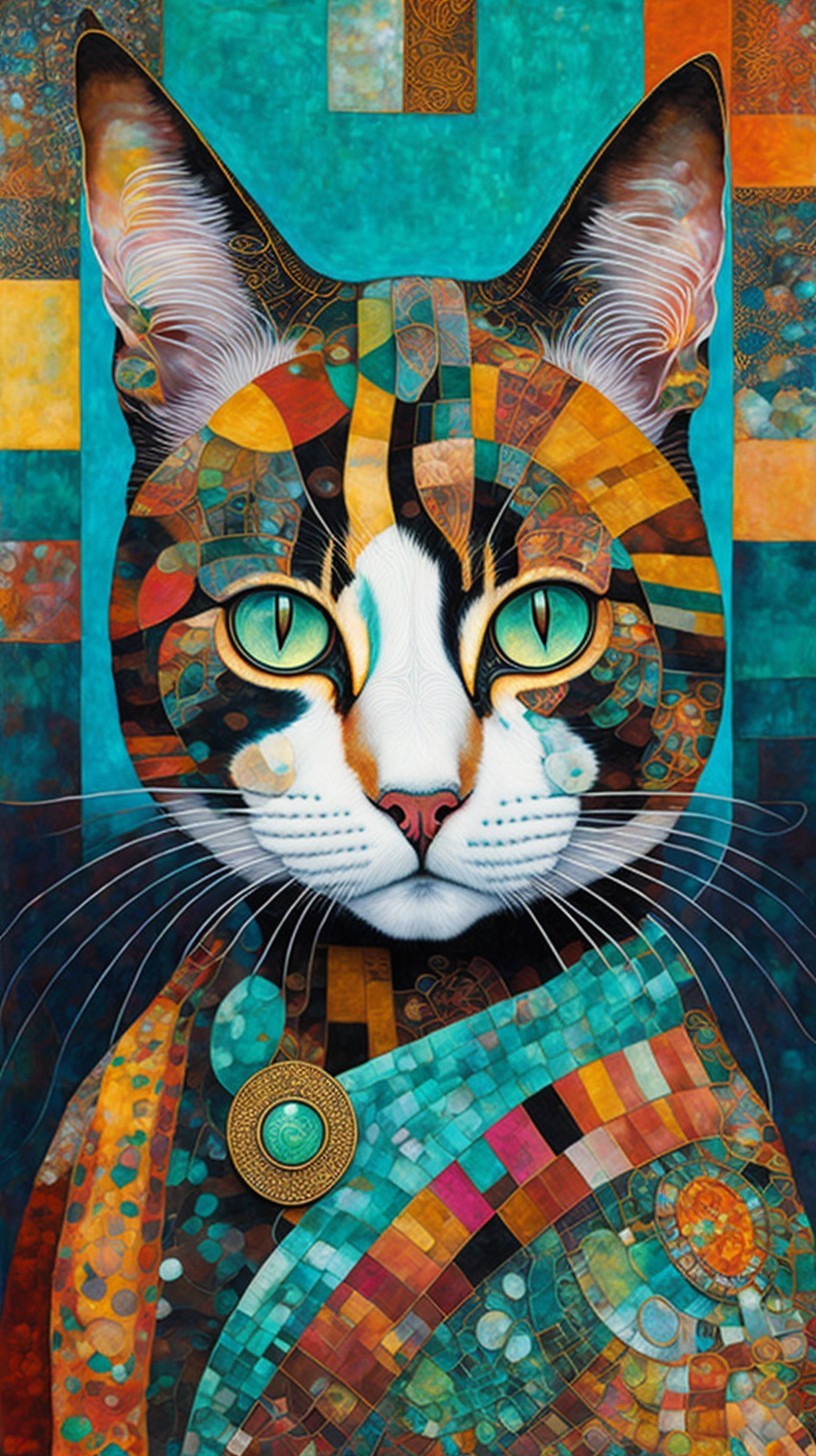 + Prompt:A chatoyant portrait of an ancient, Tortoiseshell cat goddess. “Andean Textile Patchwork" By Enki Bilal & Paul Klee & Jennifer Lommers & Hans Hartung & Meghan Duncanson & Mark Rothko & Dee Nickerson & Victor Brauner & Didier Lourenço & ∞