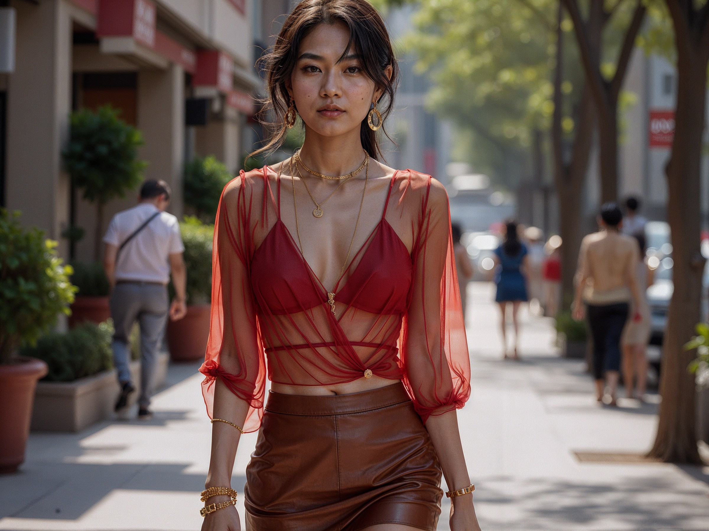 A confident young Asian woman with beige skin walks casually down the street, dressed in a striking crimson blouse and a sleek leather pencil skirt, accessorized with gold jewelry,