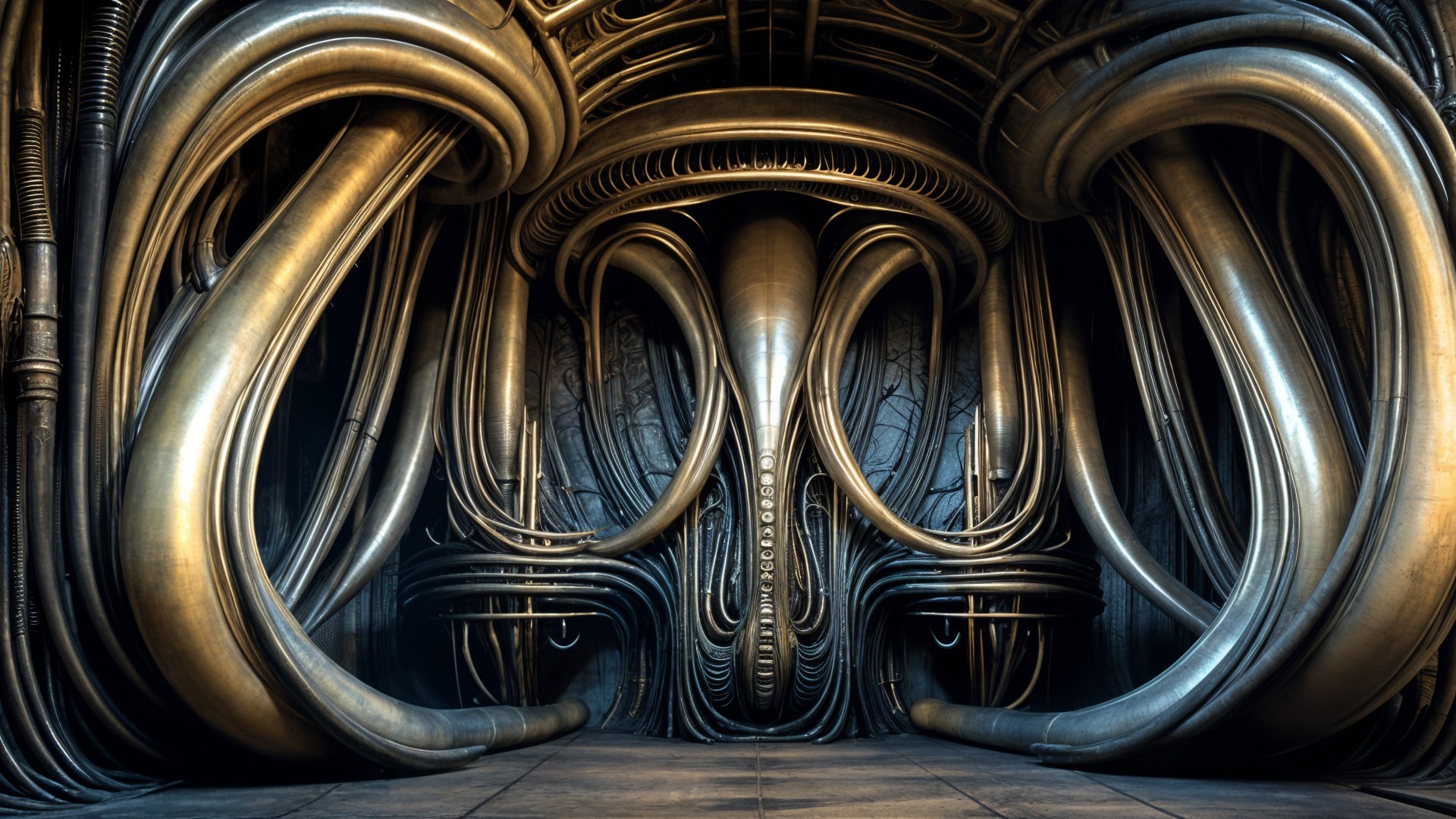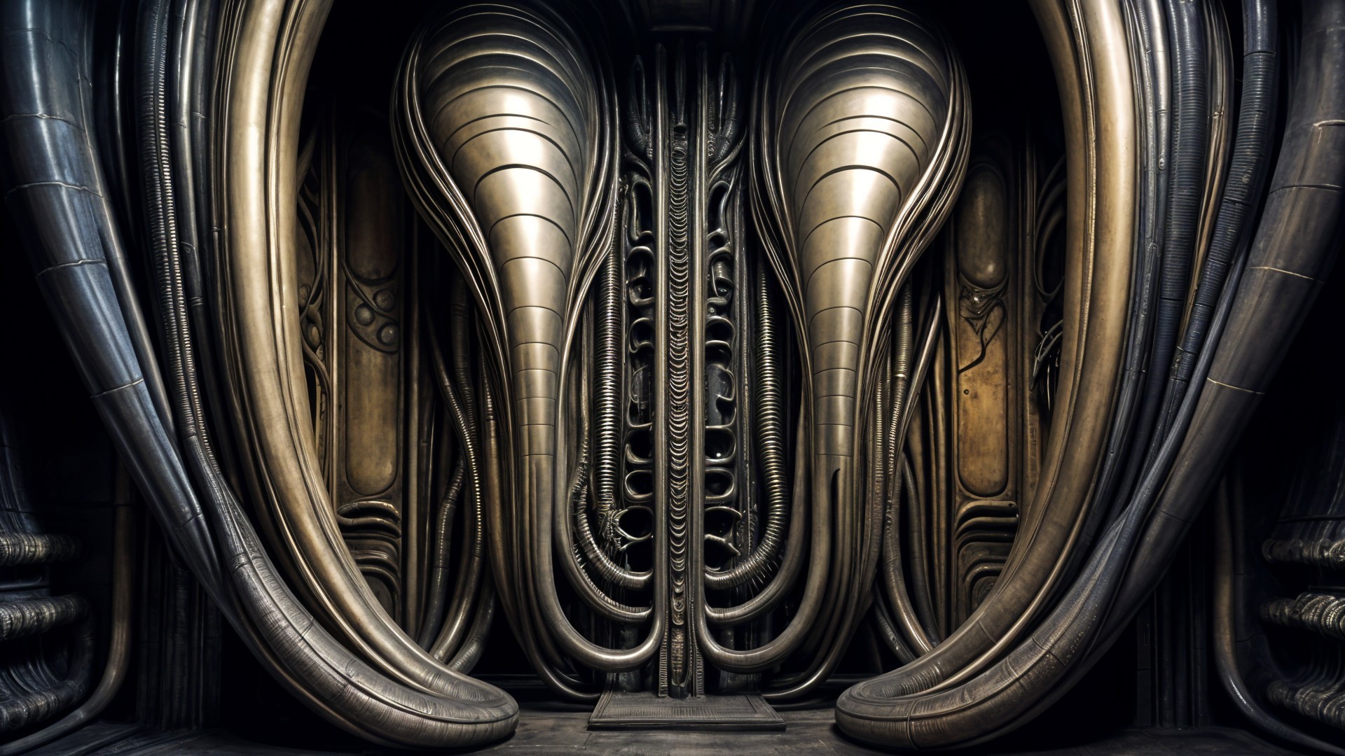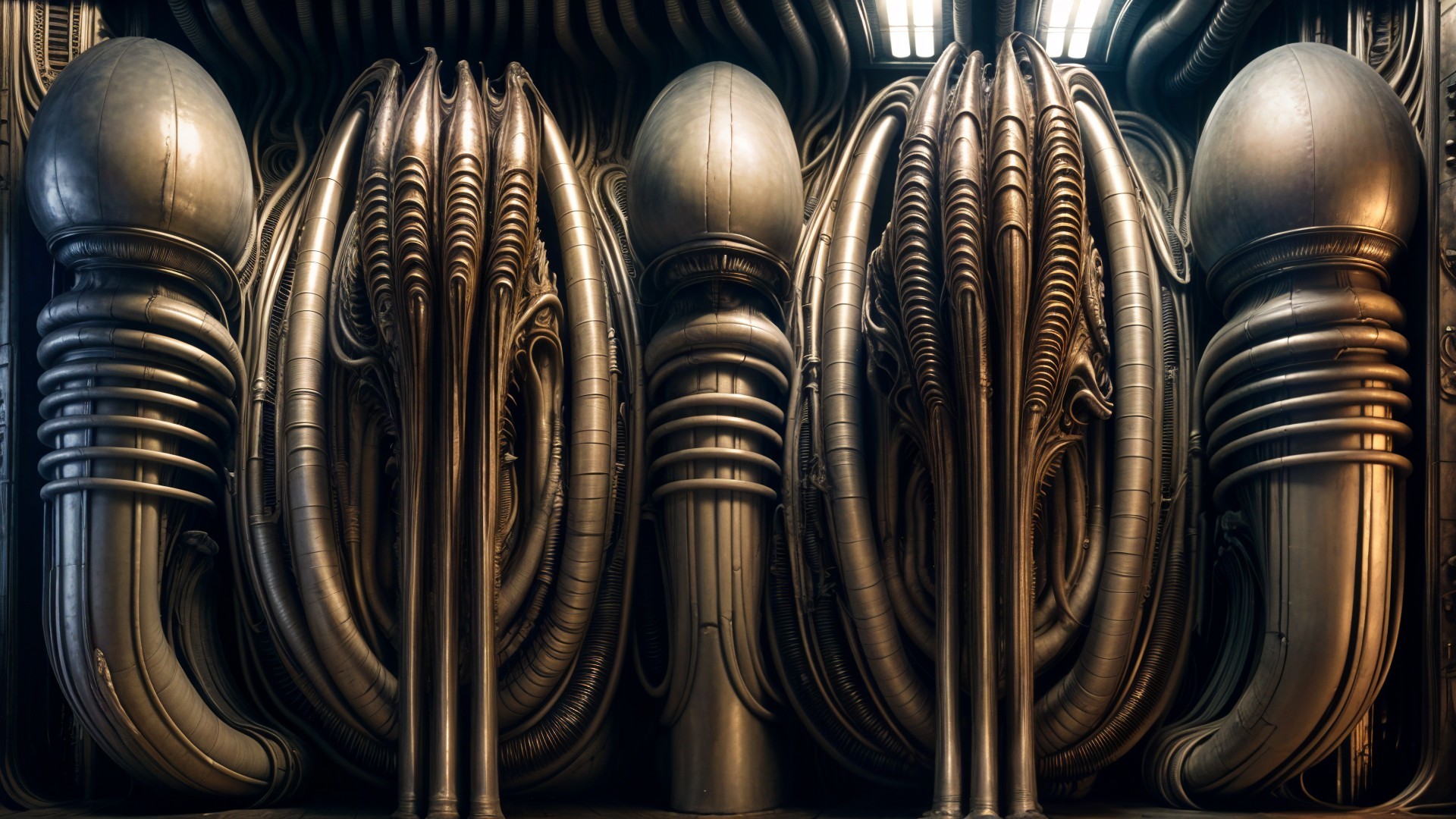 A futuristic scene featuring a series of sleek, elongated structures resembling alien beings. They are arranged in a row, with intricate details and a metallic sheen, set against a high-tech backdrop.